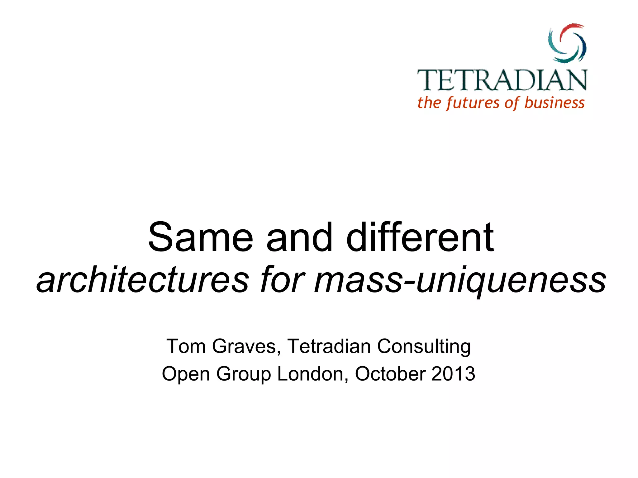 The document discusses the importance of enterprise architecture in balancing sameness and uniqueness within businesses to drive efficiency and productivity. It explores the implications of these concepts through various examples and emphasizes that while standardization aids scalability, inherent uniqueness must be recognized and accommodated. Key takeaways highlight that many industries rely on mass-uniqueness, and that a focus solely on sameness can lead to failure.