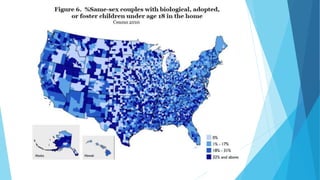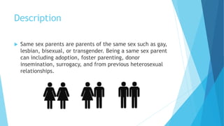 This document discusses same sex parents and provides statistics about LGBTQ families in the United States. It notes that approximately 1 in 9 million children have at least one parent who is lesbian or gay. Around 27% of same sex partner households include children. Research shows that children with same sex parents show no differences in emotional, behavioral, or social development compared to children with heterosexual parents. The document provides resources for support and strategies for making schools inclusive for all families.