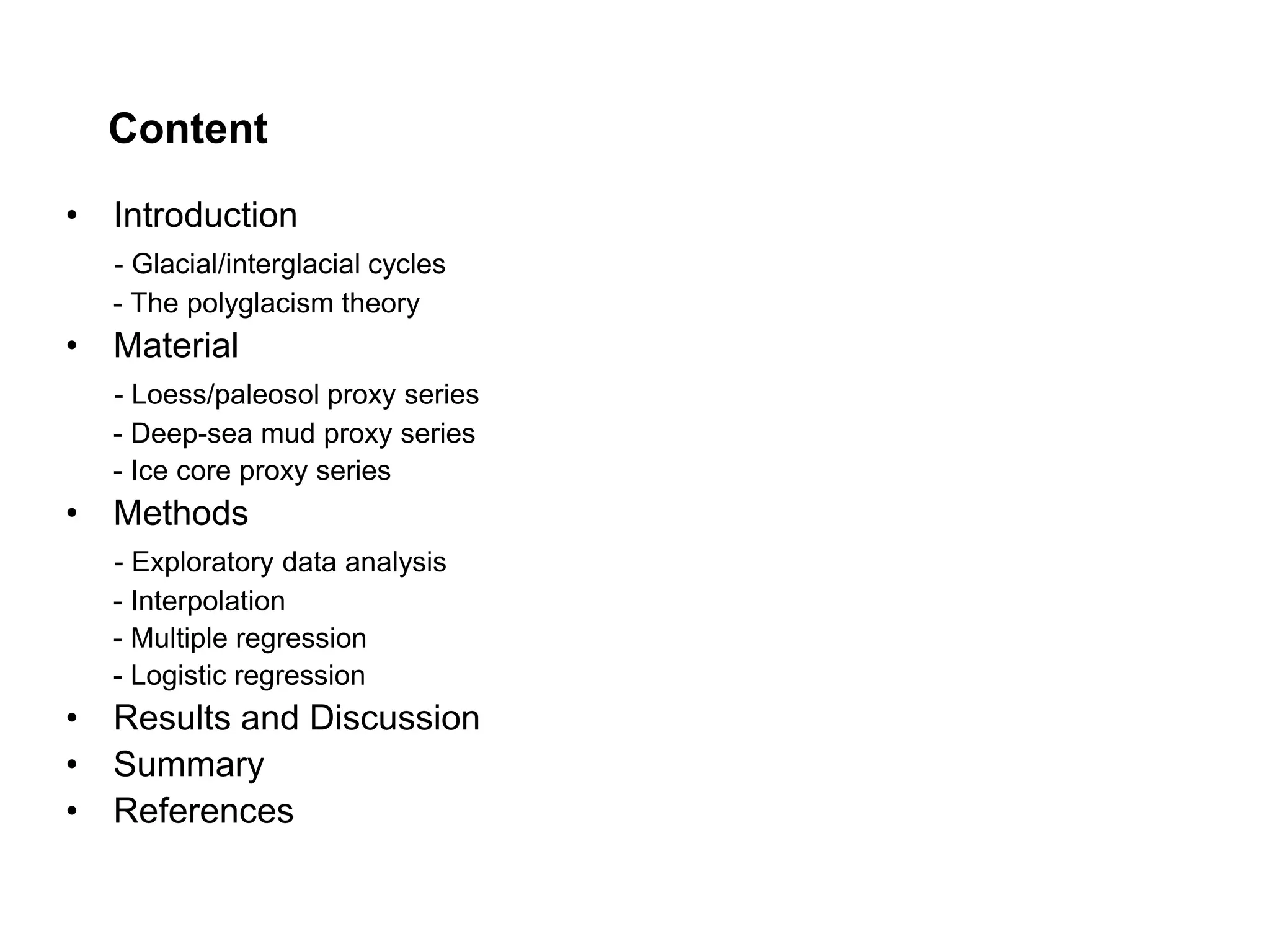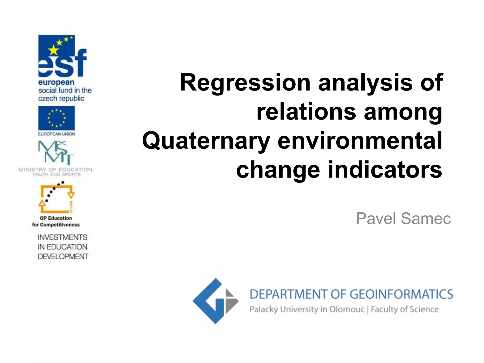 This document analyzes relationships between environmental change indicators during the Quaternary period using regression analysis. It uses proxy data from loess/paleosol sequences in China, deep sea sediments in the east Pacific, and ice cores from East Antarctica to represent glacial/interglacial cycles. Exploratory analysis, interpolation, and multiple regression methods were used to analyze relationships between the proxy records over the middle to late Pleistocene. Results found weaker correlations between soil properties and climate cycles compared to other proxies. Logistic regression also suggested temporal variability in relationships between climate change factors and sediment properties.