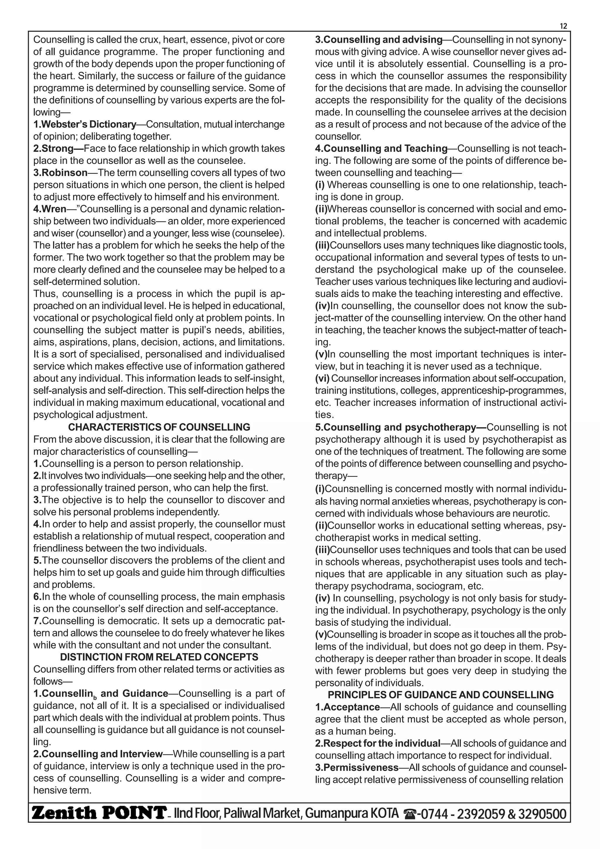 Counselling is defined as a personal relationship between two individuals where one seeks help from the other who is professionally trained. The objective of counselling is to help the individual discover and solve personal problems independently by establishing a relationship of mutual respect and trust. Counselling differs from guidance, advising, teaching, and psychotherapy in key ways such as the focus on individual problems versus academic issues, the relationship between counsellor and client, and techniques used.