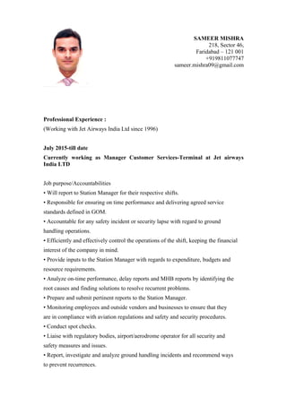 Sameer Mishra has over 18 years of experience in the aviation industry, currently working as the Manager of Customer Services at Jet Airways India. He is responsible for ensuring on-time performance, safety, security, and service standards. Previously he has held roles as Assistant Base Manager overseeing cabin crew and Assistant Manager of Service Performance evaluating catering and services. He has a diploma in French and aims to provide legendary customer service while achieving operational efficiency and excellence.