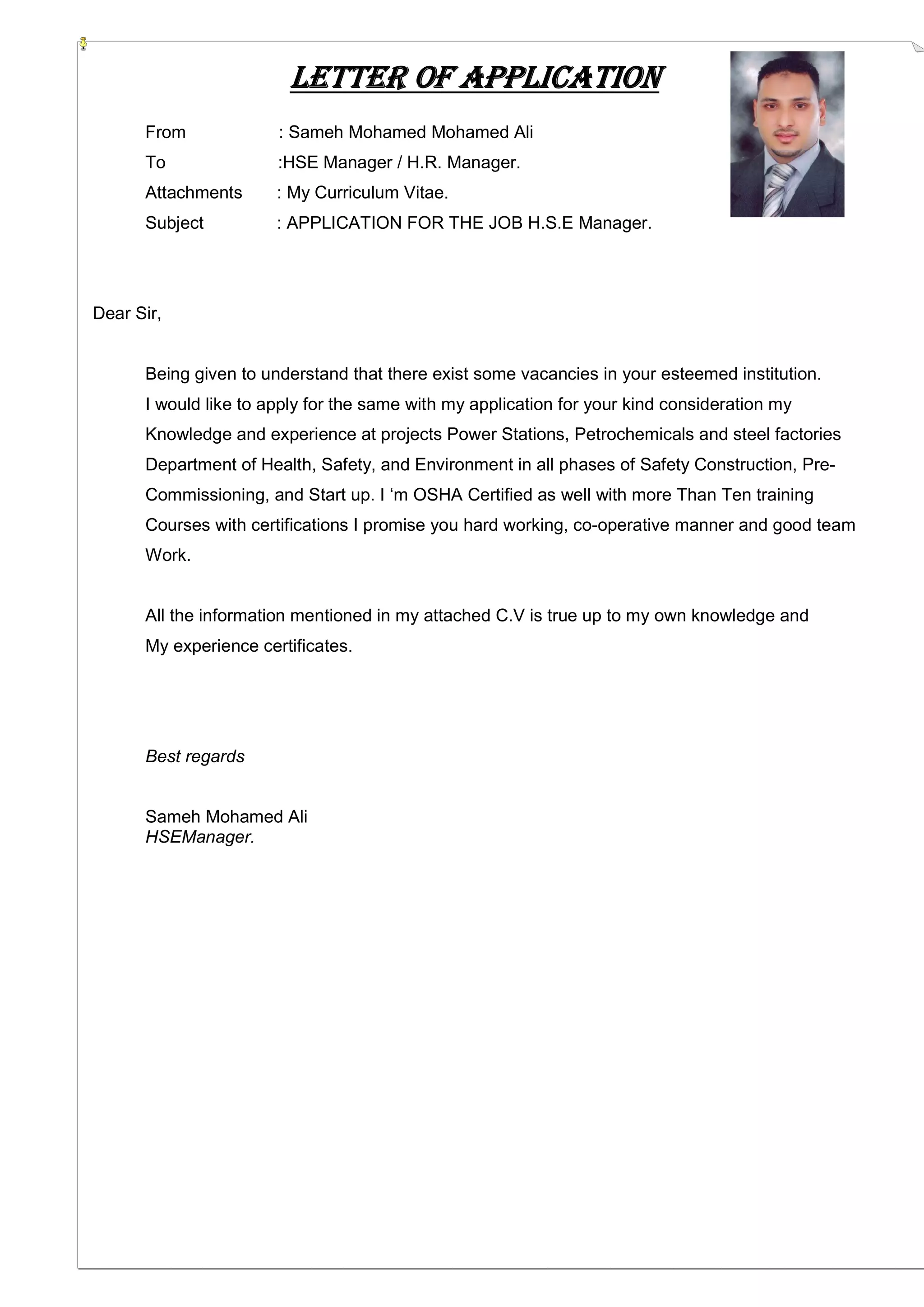 Sameh Mohamed Ali is applying for an HSE Manager position. He has over 10 years of experience in HSE roles on various power plant and industrial projects. He holds several safety certifications including OSHA and has received training in areas like construction safety, hazardous waste handling, and emergency response. He is seeking a role where he can oversee all aspects of HSE programming including training, inspections, investigations, and compliance.
