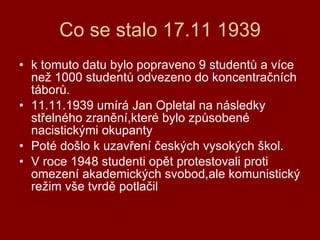 Co se stalo17.11 1939 k tomuto datu bylo popraveno 9 studentů a více než 1000 studentů odvezeno do koncentračních táborů. 11.11.1939 umírá Jan Opletal na následky střelného zranění,které bylo způsobené nacistickými okupanty Poté došlo k uzavření českých vysokých škol. V roce 1948 studenti opět protestovali proti omezení akademických svobod,ale komunistický režim vše tvrdě potlačil