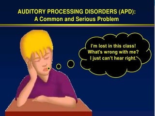 The document discusses auditory and visual processing disorders. It defines auditory processing disorder as difficulties in processing auditory information that is heard. Common areas of difficulty include phonological awareness, auditory discrimination, auditory memory, auditory sequencing, and auditory blending. Visual processing disorders refer to problems interpreting visual information and can include difficulties with visual discrimination, figure-ground perception, sequencing, motor skills, memory, closure and spatial relationships. The document provides interventions for auditory processing disorders such as using visual cues, simplifying instructions, and rhyming/sorting games to build skills.