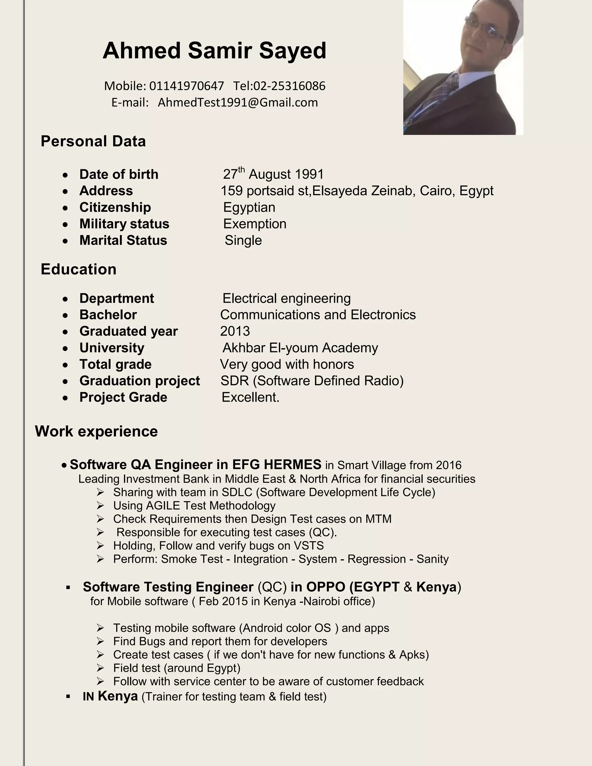 Ahmed Samir Sayed is an Egyptian software QA engineer with over 3 years of experience. He has worked for companies such as EFG Hermes, OPPO Egypt and Kenya, Nokia, and Landmark Contracting Company. Ahmed received his bachelor's degree in Communications and Electronics from Akhbar El-youm Academy in 2013. He is proficient in English, Arabic, and has begun learning German. His technical skills include software testing, databases, mobile technologies, control systems, and computer skills.