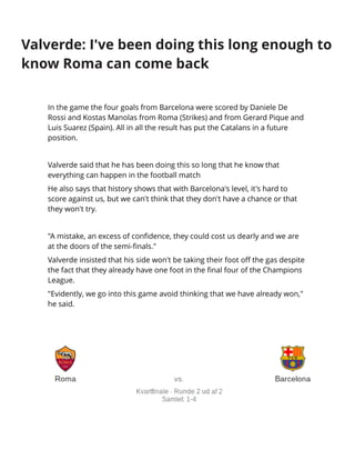 Valverde warns Barcelona not to underestimate Roma ahead of Champions League quarter-final second leg, despite a 4-1 first leg win. While Barcelona are in a strong position, Valverde notes that anything can happen in football and history shows it is hard to score against his team but Roma will try. He insists Barcelona will not be overconfident with only one leg left to reach the semi-finals.