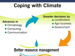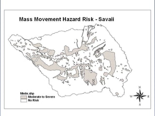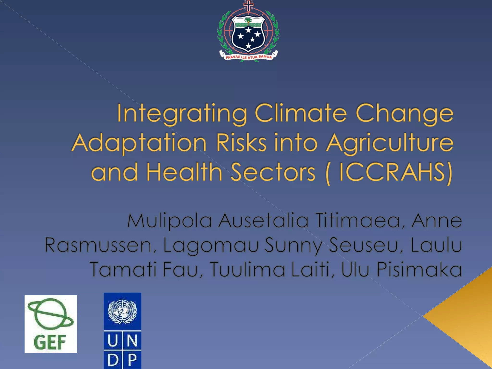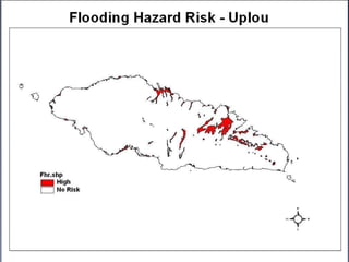 This document discusses climate change adaptation needs and strategies in Samoa. It outlines 9 priority adaptation sectors including water, forestry, health, and agriculture. It then describes a 4-year, $2 million project funded by GEF/UNDP to increase resilience to climate change impacts on health and agriculture. The project aims to enhance climate monitoring, strengthen agricultural and health policies, and demonstrate adaptation best practices through three pilot programs focused on climate information systems, vector-borne diseases, and water salinity/hypertension.