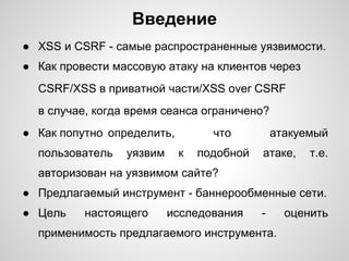 Документ посвящен массовым CSRF-атакам через Flash-рекламу и исследует уязвимости, связанные с XSS и CSRF. Описываются методы определения уязвимых пользователей и возможности использования баннерообменных сетей для проведения атак. Исследование показывает, что уязвимые Flash-баннеры могут быть опасными и требуют средств для их обнаружения.