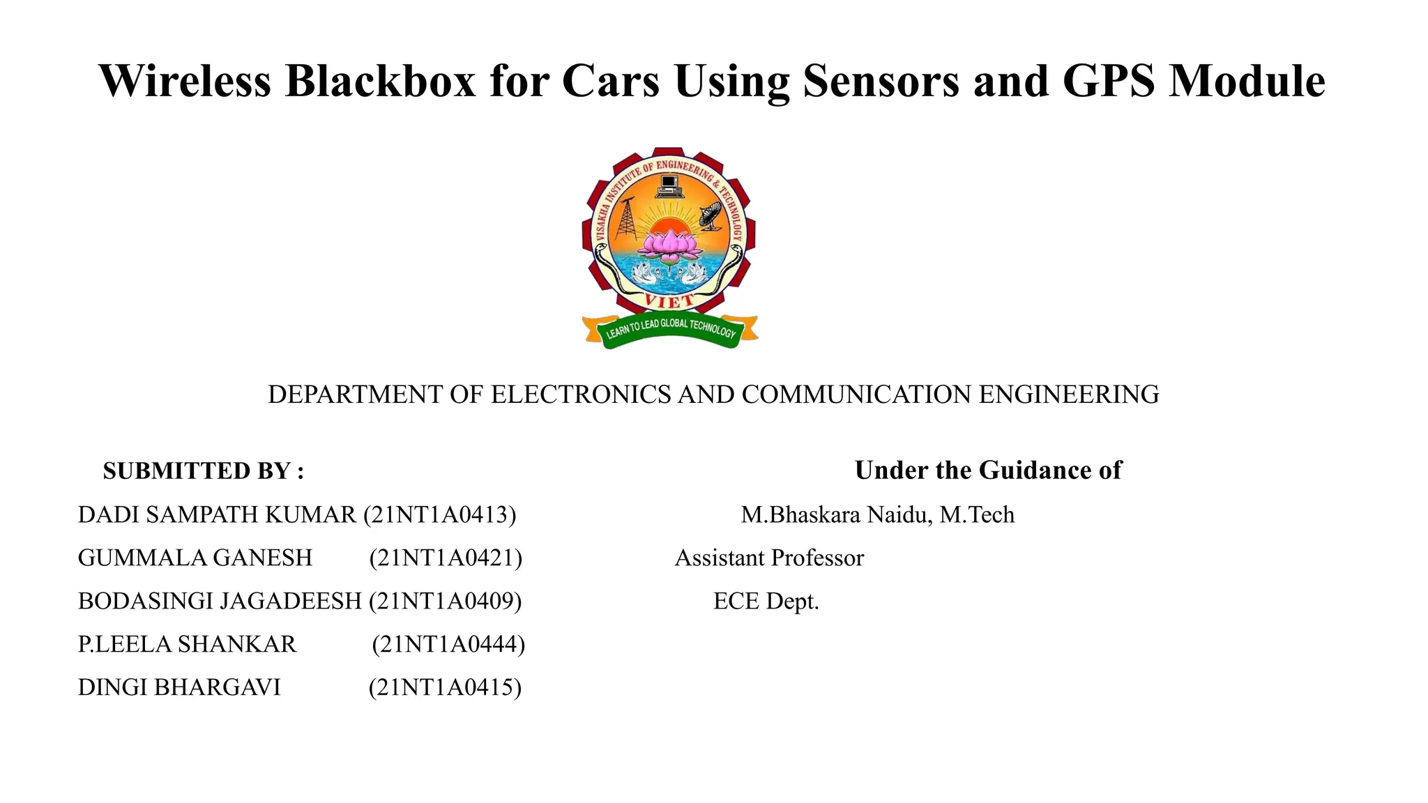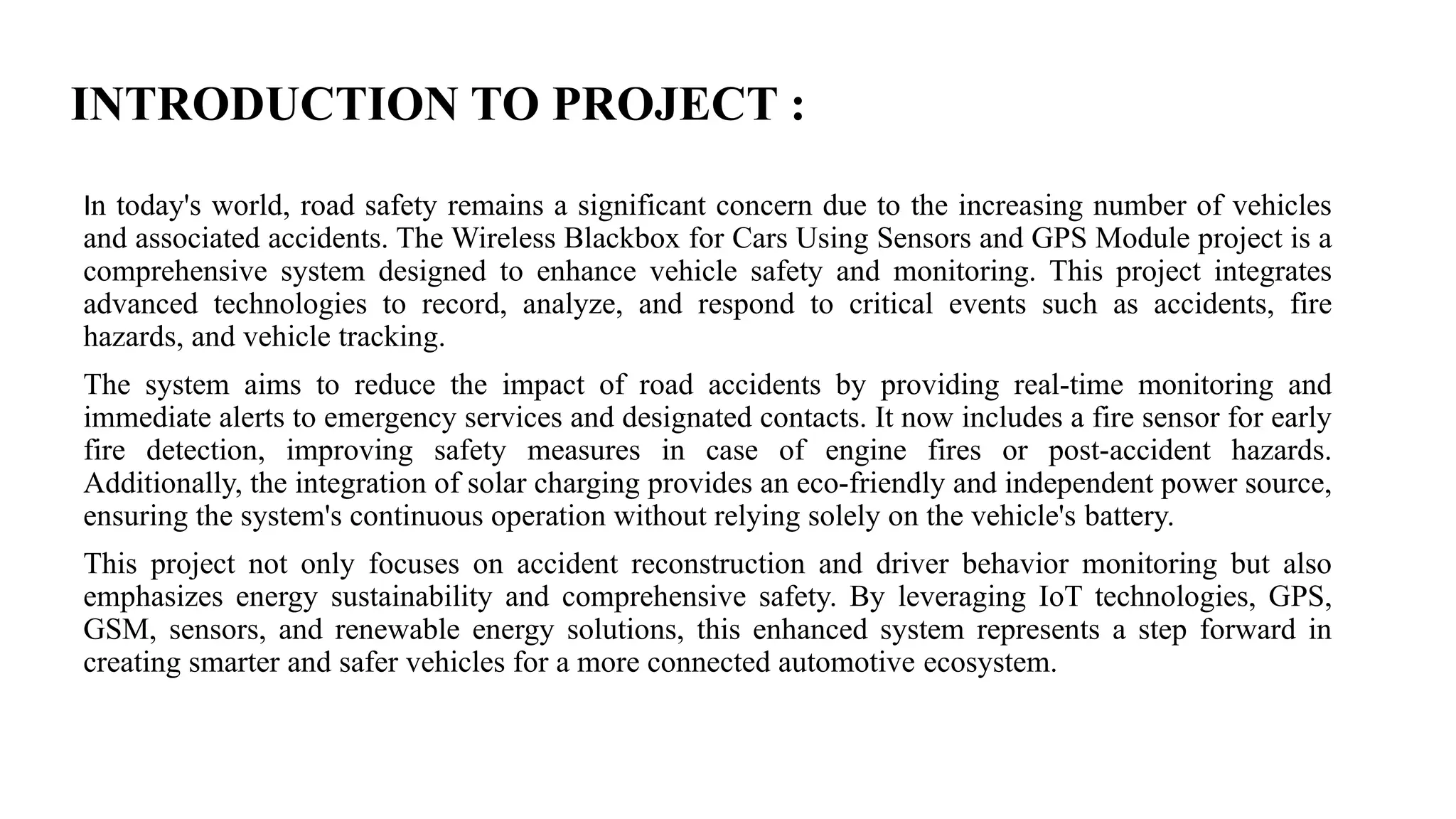 The document presents the design of a wireless blackbox for cars, utilizing sensors and GPS technology to enhance road safety and emergency response. It integrates features such as accident detection, fire hazard alerts, and GPS tracking, while promoting energy sustainability through a solar-powered system. The project aims to leverage IoT advancements to create safer vehicles and improve monitoring of driver behavior.
