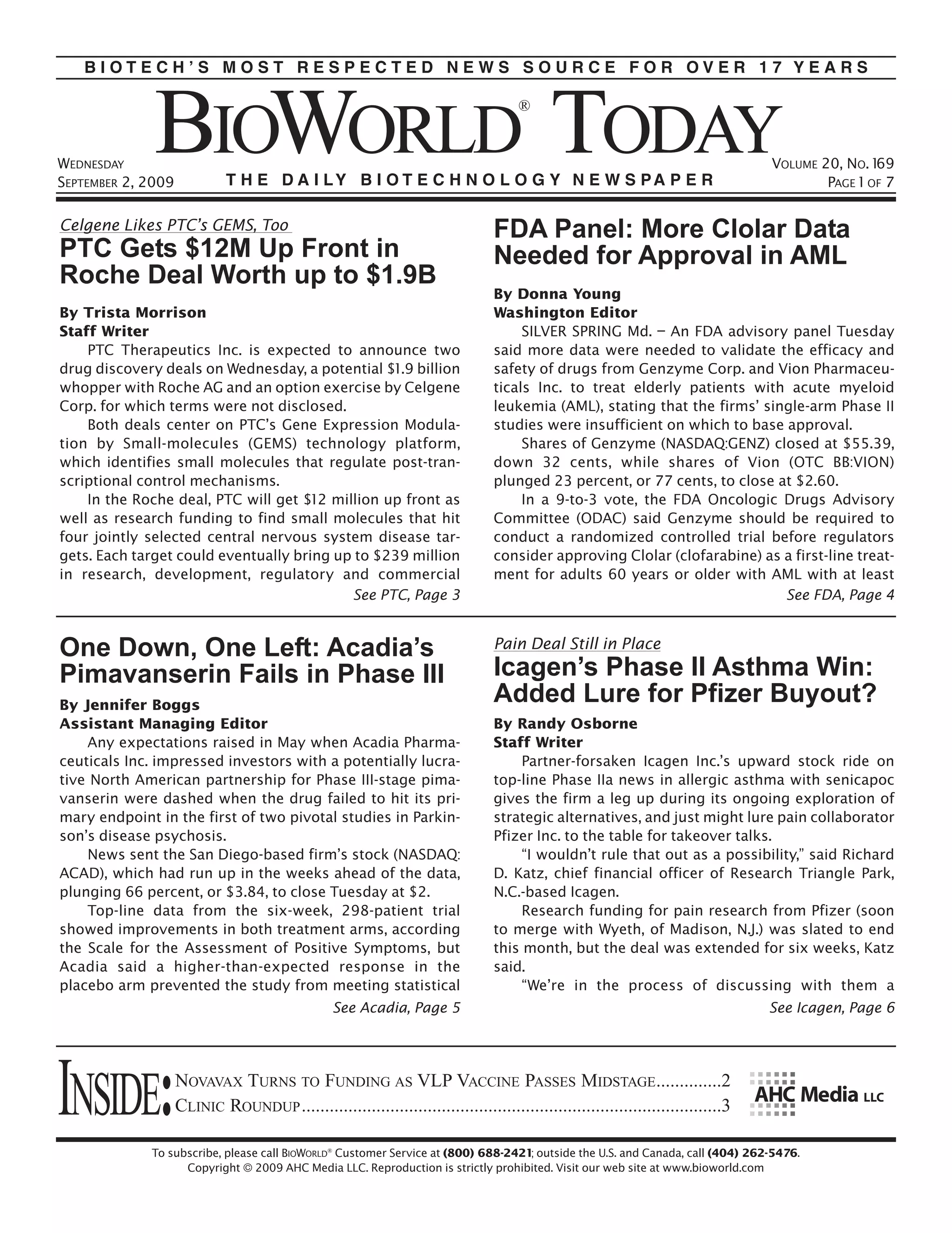 BIOTECHโ€™S MOST RESPECTEDNEWS SOURCE FOR OVER 17 YEARS WEDNESDAY VOLUME 20, NO. 169 SEPTEMBER 2, 2009 PAGE 1 OF 7 Celgene Likes PTCโ€™s GEMS, Too FDA Panel: More Clolar Data PTC Gets $12M Up Front in Needed for Approval in AML Roche Deal Worth up to $1.9B By Donna Young By Trista Morrison Washington Editor Staff Writer SILVER SPRING Md. โ€“ An FDA advisory panel Tuesday PTC Therapeutics Inc. is expected to announce two said more data were needed to validate the efficacy and drug discovery deals on Wednesday, a potential $1.9 billion safety of drugs from Genzyme Corp. and Vion Pharmaceu- whopper with Roche AG and an option exercise by Celgene ticals Inc. to treat elderly patients with acute myeloid Corp. for which terms were not disclosed. leukemia (AML), stating that the firmsโ€™ single-arm Phase II Both deals center on PTCโ€™s Gene Expression Modula- studies were insufficient on which to base approval. tion by Small-molecules (GEMS) technology platform, Shares of Genzyme (NASDAQ:GENZ) closed at $55.39, which identifies small molecules that regulate post-tran- down 32 cents, while shares of Vion (OTC BB:VION) scriptional control mechanisms. plunged 23 percent, or 77 cents, to close at $2.60. In the Roche deal, PTC will get $12 million up front as In a 9-to-3 vote, the FDA Oncologic Drugs Advisory well as research funding to find small molecules that hit Committee (ODAC) said Genzyme should be required to four jointly selected central nervous system disease tar- conduct a randomized controlled trial before regulators gets. Each target could eventually bring up to $239 million consider approving Clolar (clofarabine) as a first-line treat- in research, development, regulatory and commercial ment for adults 60 years or older with AML with at least See PTC, Page 3 See FDA, Page 4 One Down, One Left: Acadiaโ€™s Pain Deal Still in Place Pimavanserin Fails in Phase III Icagenโ€™s Phase II Asthma Win: By Jennifer Boggs Added Lure for Pfizer Buyout? Assistant Managing Editor By Randy Osborne Any expectations raised in May when Acadia Pharma- Staff Writer ceuticals Inc. impressed investors with a potentially lucra- Partner-forsaken Icagen Inc.โ€™s upward stock ride on tive North American partnership for Phase III-stage pima- top-line Phase IIa news in allergic asthma with senicapoc vanserin were dashed when the drug failed to hit its pri- gives the firm a leg up during its ongoing exploration of mary endpoint in the first of two pivotal studies in Parkin- strategic alternatives, and just might lure pain collaborator sonโ€™s disease psychosis. Pfizer Inc. to the table for takeover talks. News sent the San Diego-based firmโ€™s stock (NASDAQ: โ€œI wouldnโ€™t rule that out as a possibility,โ€ said Richard ACAD), which had run up in the weeks ahead of the data, D. Katz, chief financial officer of Research Triangle Park, plunging 66 percent, or $3.84, to close Tuesday at $2. N.C.-based Icagen. Top-line data from the six-week, 298-patient trial Research funding for pain research from Pfizer (soon showed improvements in both treatment arms, according to merge with Wyeth, of Madison, N.J.) was slated to end the Scale for the Assessment of Positive Symptoms, but this month, but the deal was extended for six weeks, Katz Acadia said a higher-than-expected response in the said. placebo arm prevented the study from meeting statistical โ€œWeโ€™re in the process of discussing with them a See Acadia, Page 5 See Icagen, Page 6 INSIDE: NOVAVAX TURNS TO FUNDING AS VLP VACCINE PASSES MIDSTAGE..............2 CLINIC ROUNDUP ..........................................................................................3 To subscribe, please call BIOWORLDยฎ Customer Service at (800) 688-2421; outside the U.S. and Canada, call (404) 262-5476. Copyright ยฉ 2009 AHC Media LLC. Reproduction is strictly prohibited. Visit our web site at www.bioworld.com