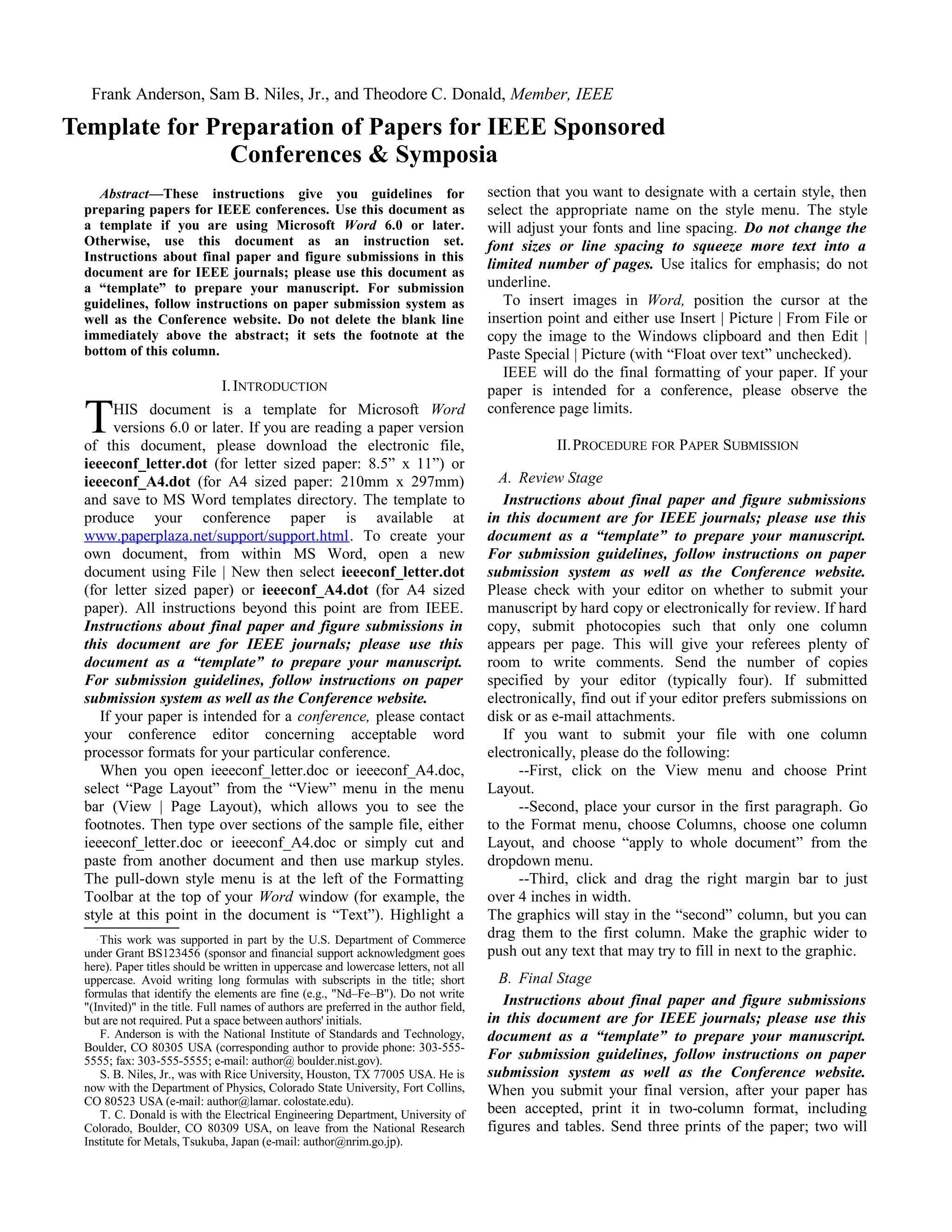 This document provides instructions for preparing papers for IEEE conferences using Microsoft Word. It details guidelines for formatting, figures, units, and equations. Authors should use the document as a template and submit final papers and figures according to the specified instructions in order to prepare their manuscript for IEEE publication.