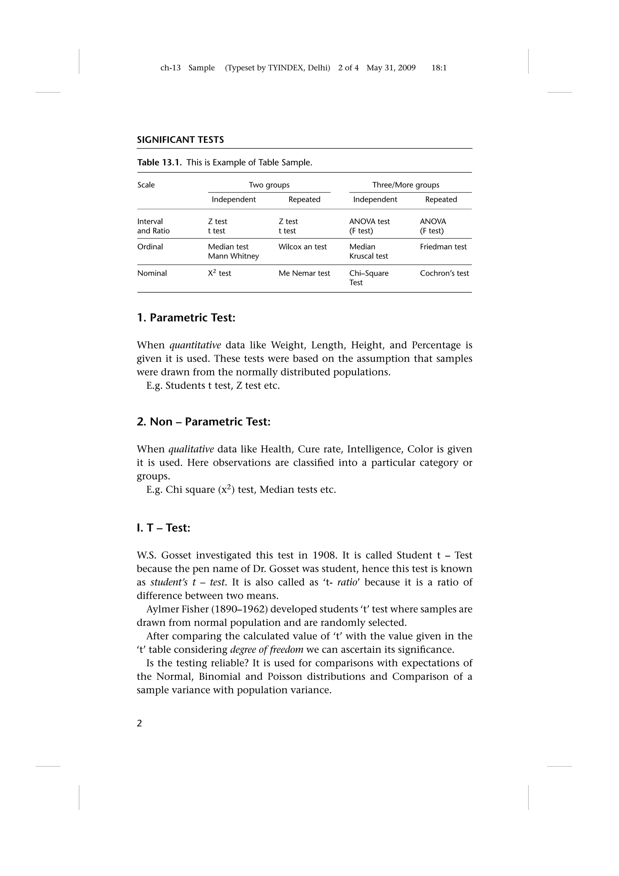 This document discusses different statistical tests used to determine if results from an experiment occurred by chance or indicate a real difference. It explains that the appropriate test depends on factors like the scale of measurement, number of groups, and sample size. Parametric tests are used for quantitative data from normally distributed populations, while non-parametric tests are for qualitative data involving categorical groups. The t-test is described as a commonly used parametric test to compare two means.