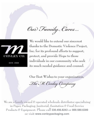 The document is a newsletter from The M. Conley Company, a family-owned wholesale distributor of paper, packaging, janitorial, sanitation, and food service products and equipment. The newsletter thanks the Domestic Violence Project for its support of individuals in the community and welcomes the Pro Football Hall of Fame Class of 2008 and distinguished guests.