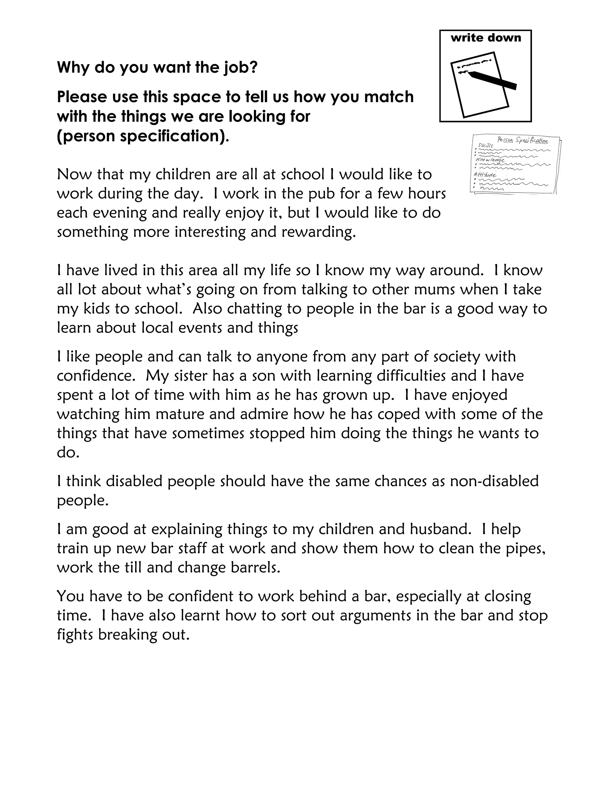 The applicant is applying for a job working with people with learning difficulties. She currently works part-time at a pub but is looking for something more rewarding during the day now that her children are in school. She has experience helping and communicating with people from different backgrounds through her work at the pub. She also has experience assisting her nephew who has learning difficulties. While she has no direct experience working with people with learning difficulties, she is willing to learn. She works well as part of a team at the pub and can perform tasks like training new employees.