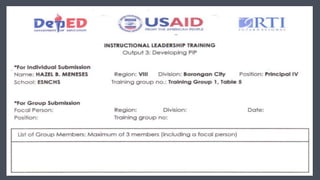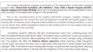 The document outlines a project initiative plan led by Hazel B. Meneses focusing on various aspects of language development, including oral language, phonological awareness, vocabulary, fluency, and comprehension. It includes a detailed lesson matrix and discussion points to align with shared school vision and smart goals. Additionally, there is an emphasis on the application of the project in the workplace.