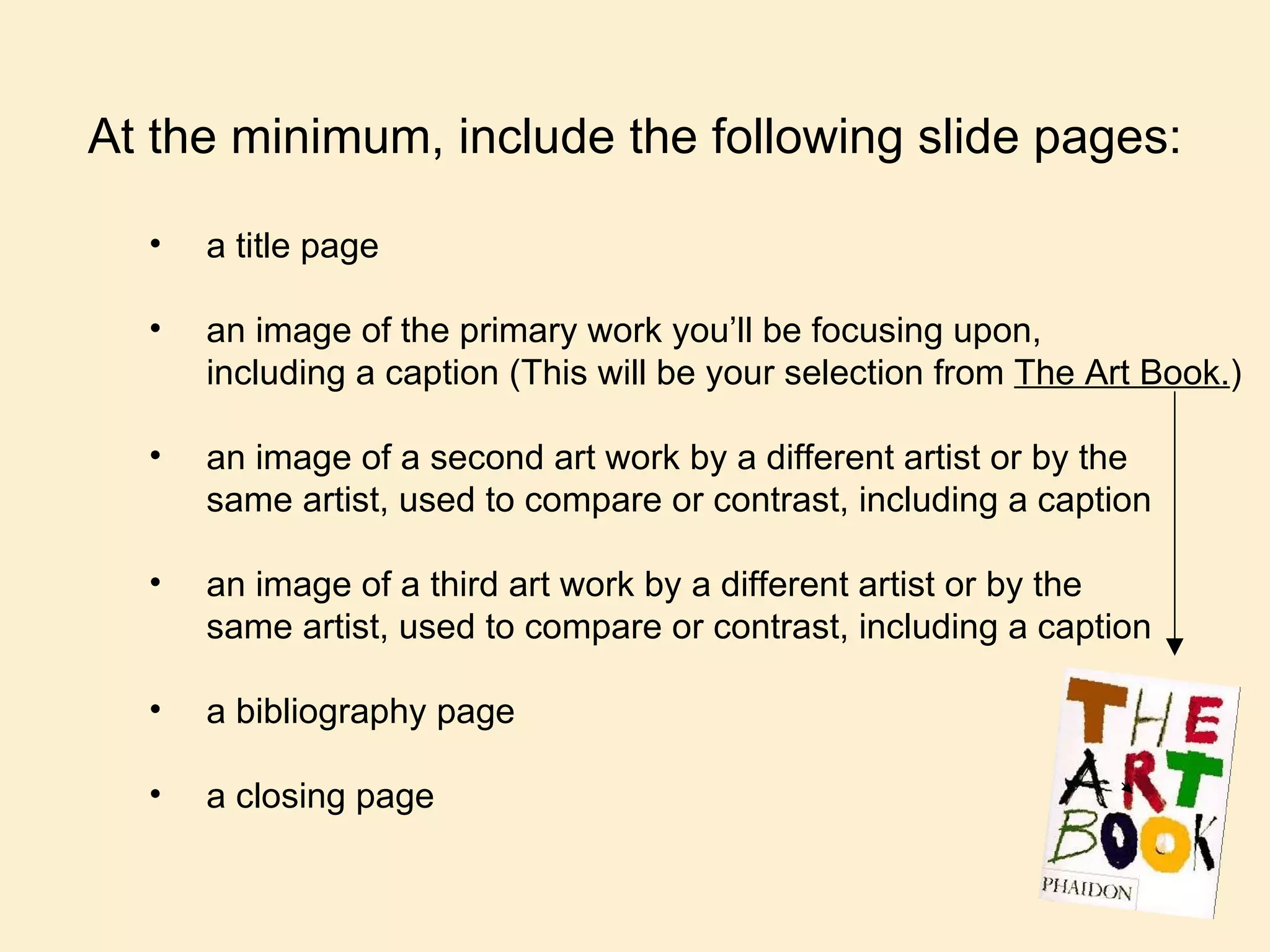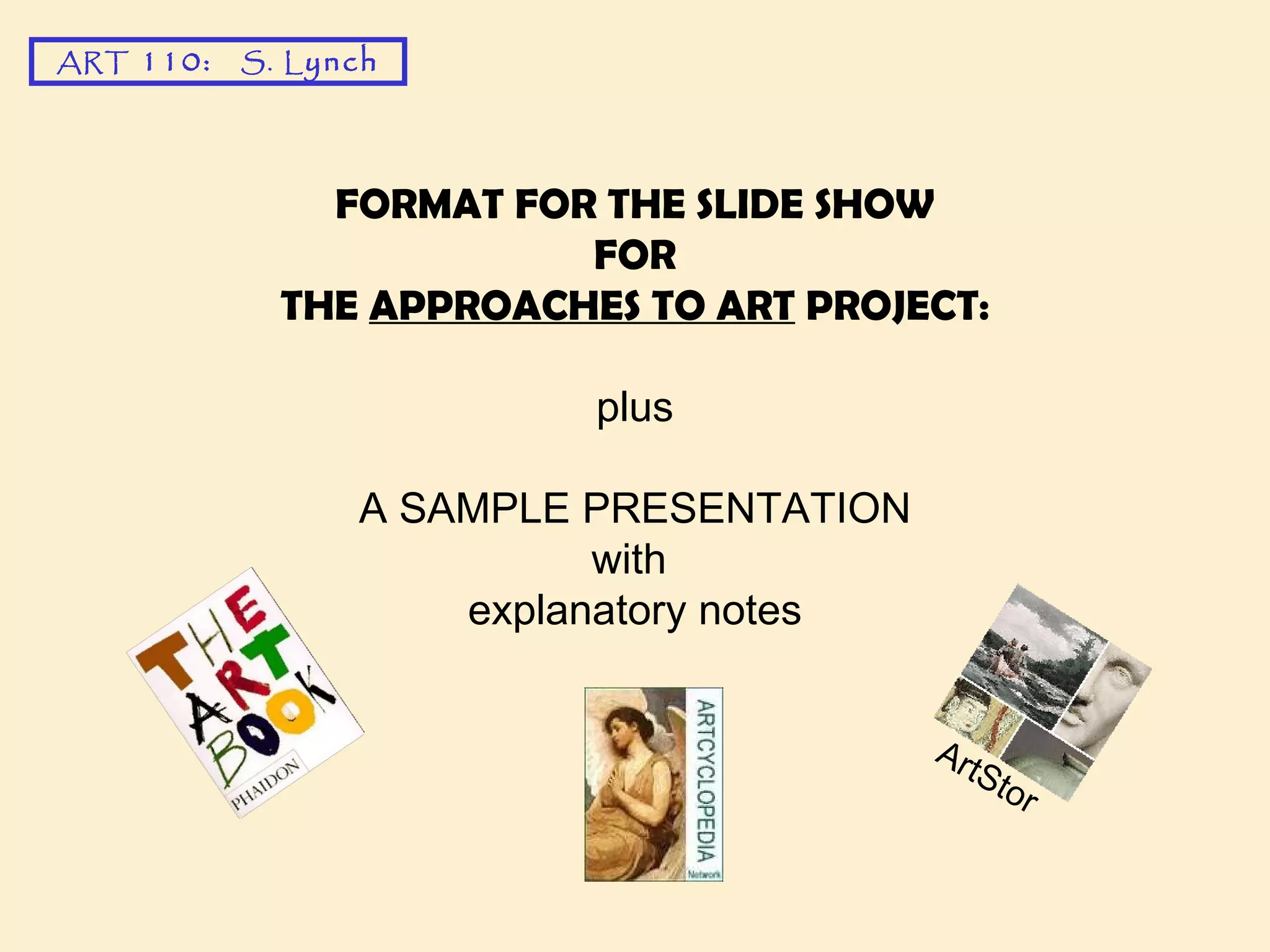 The document outlines the format for a slide show project in an art course, specifying the required components such as a title page, images of artworks for comparison, a bibliography, and minimum slide counts. It emphasizes the importance of presenting a psychological approach to a chosen artwork with examples and resources for citation. The document also includes a sample presentation as a guide.