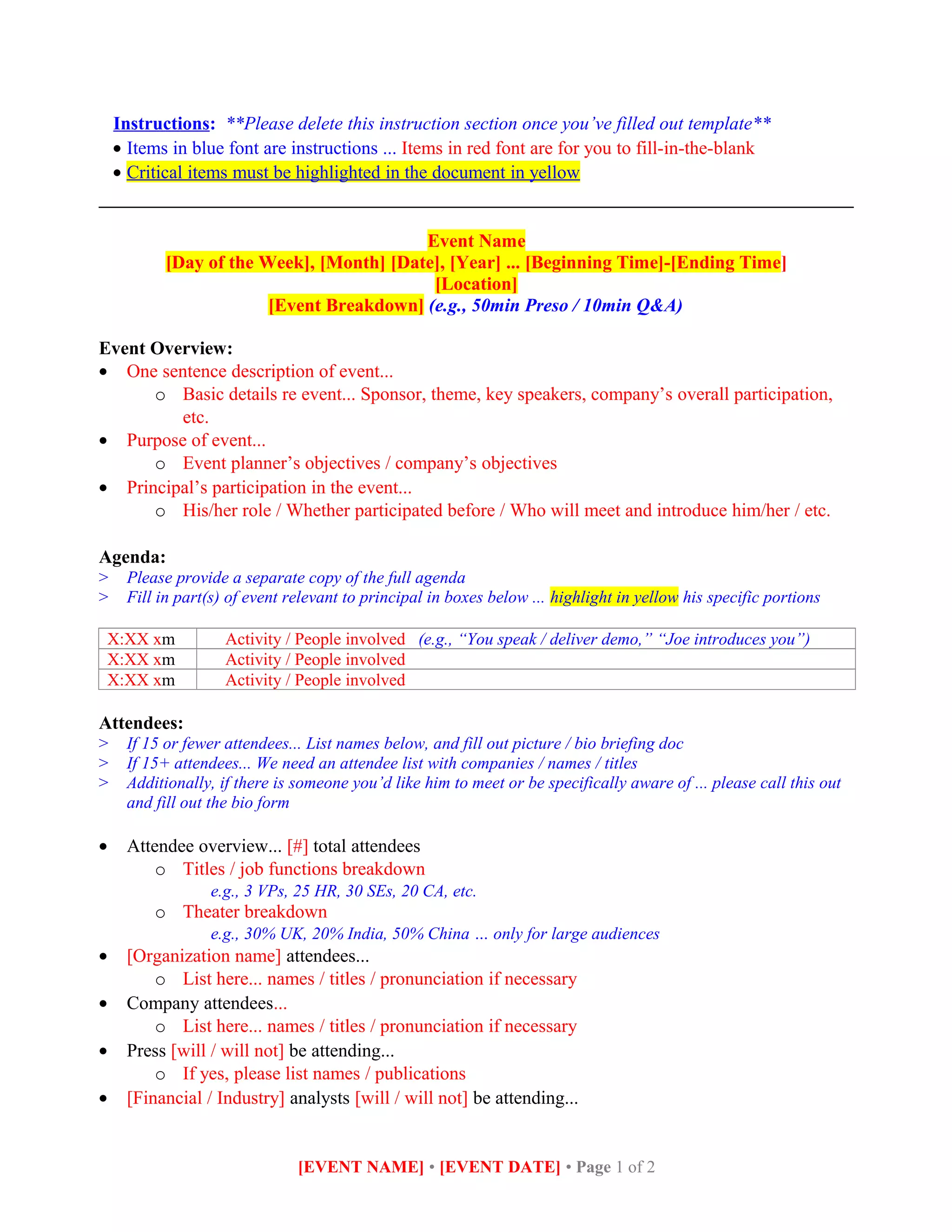 The document provides details about an upcoming event including the date, location, overview, agenda, attendees, and the principal's role. The event will take place on [Day of the Week], [Month] [Date], [Year] at [Location] and will include a [Event Breakdown] (e.g. 50min presentation and 10min Q&A). There will be approximately [#] total attendees from [Titles/job functions] and from [Countries/regions]. The principal will [Activity] from [Time] to [Time] and the objectives are to [Objectives]. [Number] key messages and [Hot buttons/questions] are outlined for the principal. [Additional docs] are attached