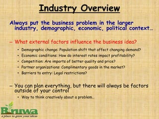 The document outlines key considerations for developing business ideas within various contexts, such as demographic, economic, and competitive factors. It presents multiple case scenarios highlighting potential target markets and services, emphasizing the importance of understanding customer needs and market gaps. A comprehensive business plan structure is provided, addressing product overviews, marketing strategies, and financial planning to effectively capture market opportunities.