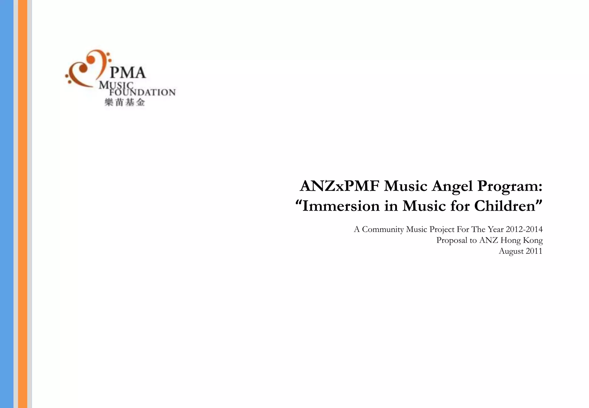 The ANZxPMF Music Angel Program proposes a community music project targeting underprivileged primary school students in Hong Kong from 2012-2014. The 2012 program includes children's recorder lessons taught by ANZ volunteers, two music appreciation talks, and a children's choir called the ANZ Music Angel Choir. The choir will perform with a pianist in a charity concert to raise funds and awareness. If supported, the program aims to provide underprivileged youth with opportunities to learn, appreciate, and share music.
