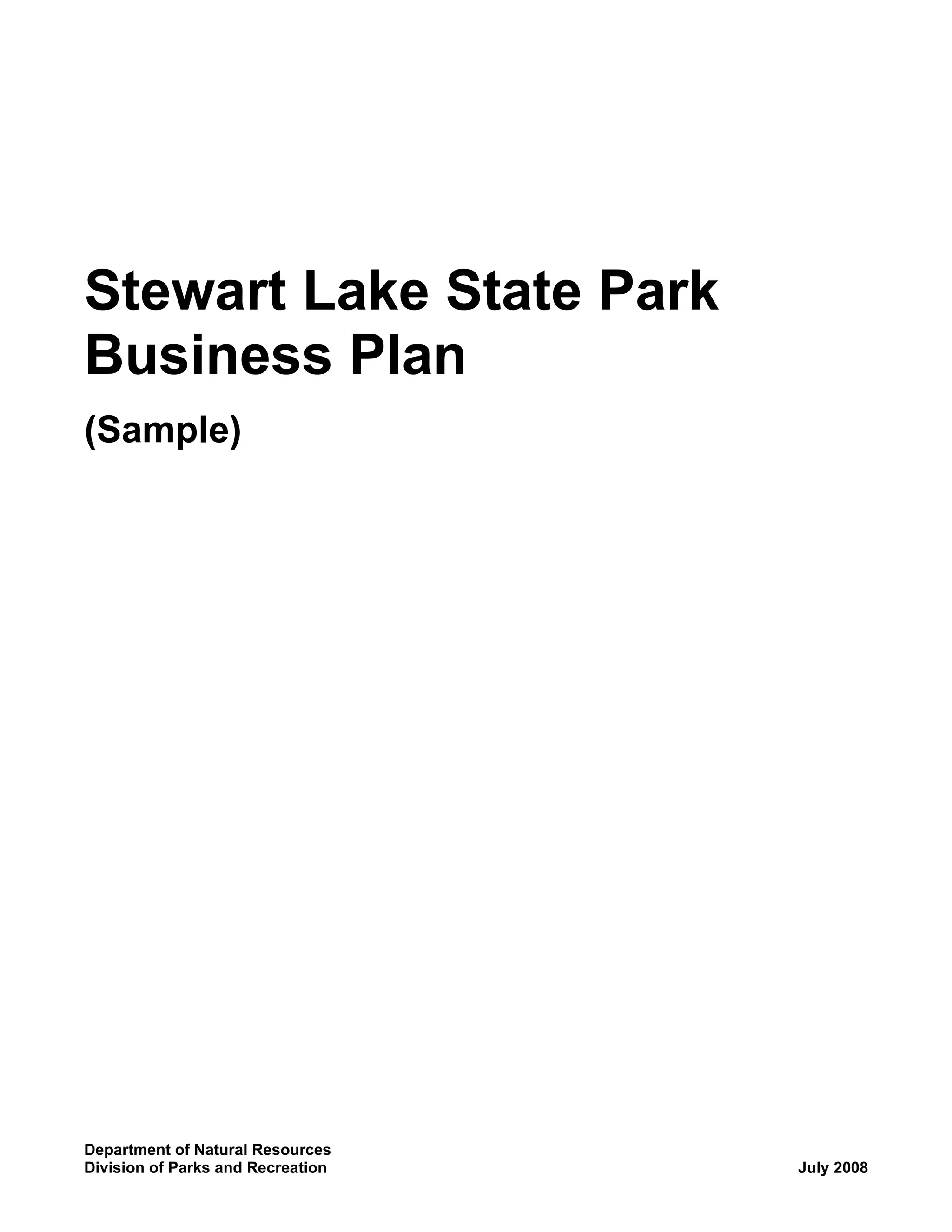 This document provides a business plan for Stewart Lake State Park, which offers camping, boating, fishing, hiking, and OHV trails across six campgrounds. It describes the park's facilities, personnel plan, strengths, weaknesses, opportunities and threats. Financial analysis and strategies are presented to increase revenues from overnight camping, day use, and fishing over the next 5 years.
