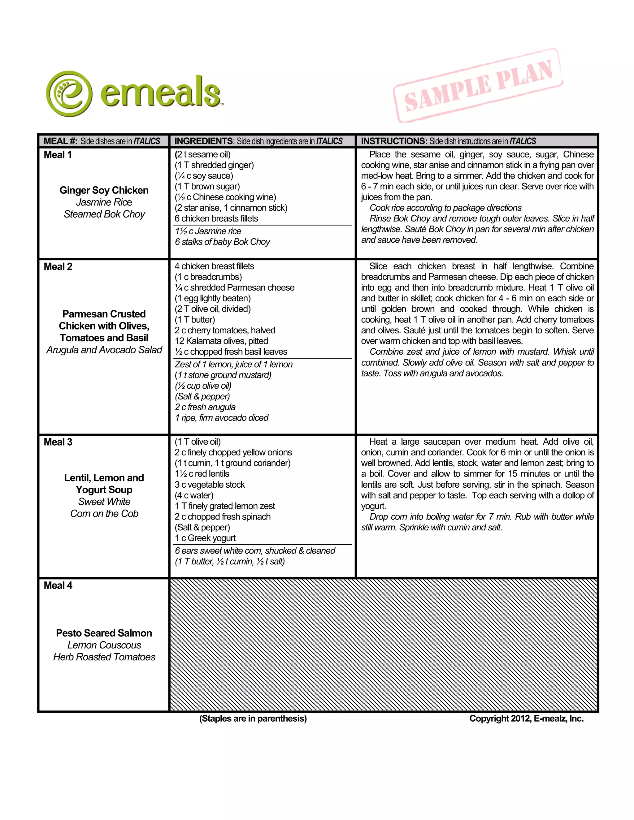 The document provides 7 meal plans with recipes and grocery lists. Each meal plan includes a main dish and 1-2 side dishes. The recipes include ingredients and instructions. The grocery lists detail the specific items needed to prepare each meal along with staples that should generally be on hand. The document aims to help readers easily plan weekly meals and generate targeted grocery lists.