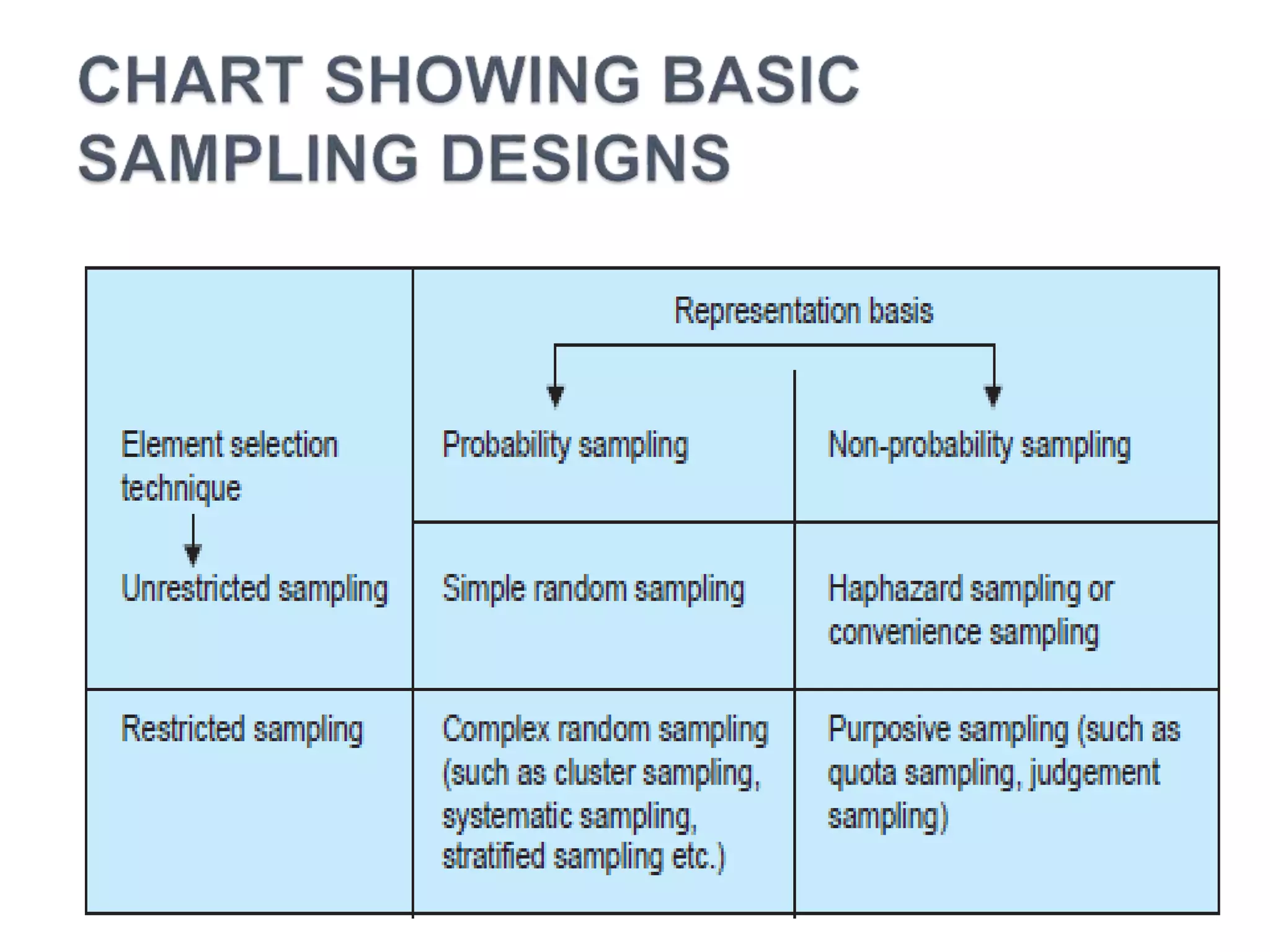 This document discusses various sampling designs and their characteristics. It describes probability sampling designs like simple random sampling which gives every unit an equal chance of selection. It also describes non-probability sampling designs like purposive sampling which involves deliberately choosing units. Specific probability designs discussed include systematic sampling, stratified sampling, cluster sampling, area sampling, and multi-stage sampling.