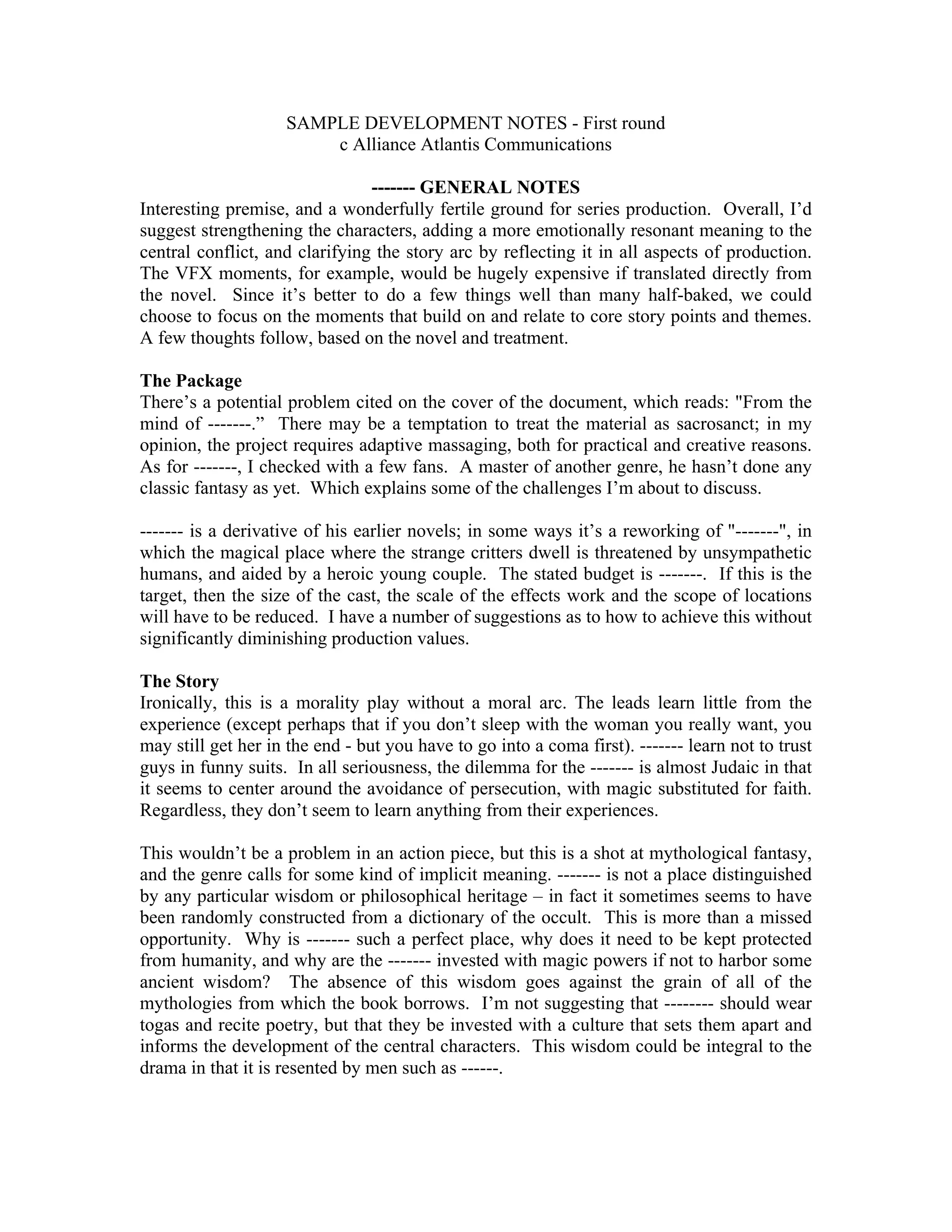 This document provides development notes for adapting a novel into a television series. It suggests strengthening the characters and adding more emotional meaning to the central conflict. While the fantasy world described in the novel could be very expensive to depict, alternatives are proposed to reduce costs, such as portraying the world as idealized or through the characters' state of mind. Overall, the summary emphasizes that no amount of special effects will compensate for a lack of believable characters and grounded personal dilemmas.