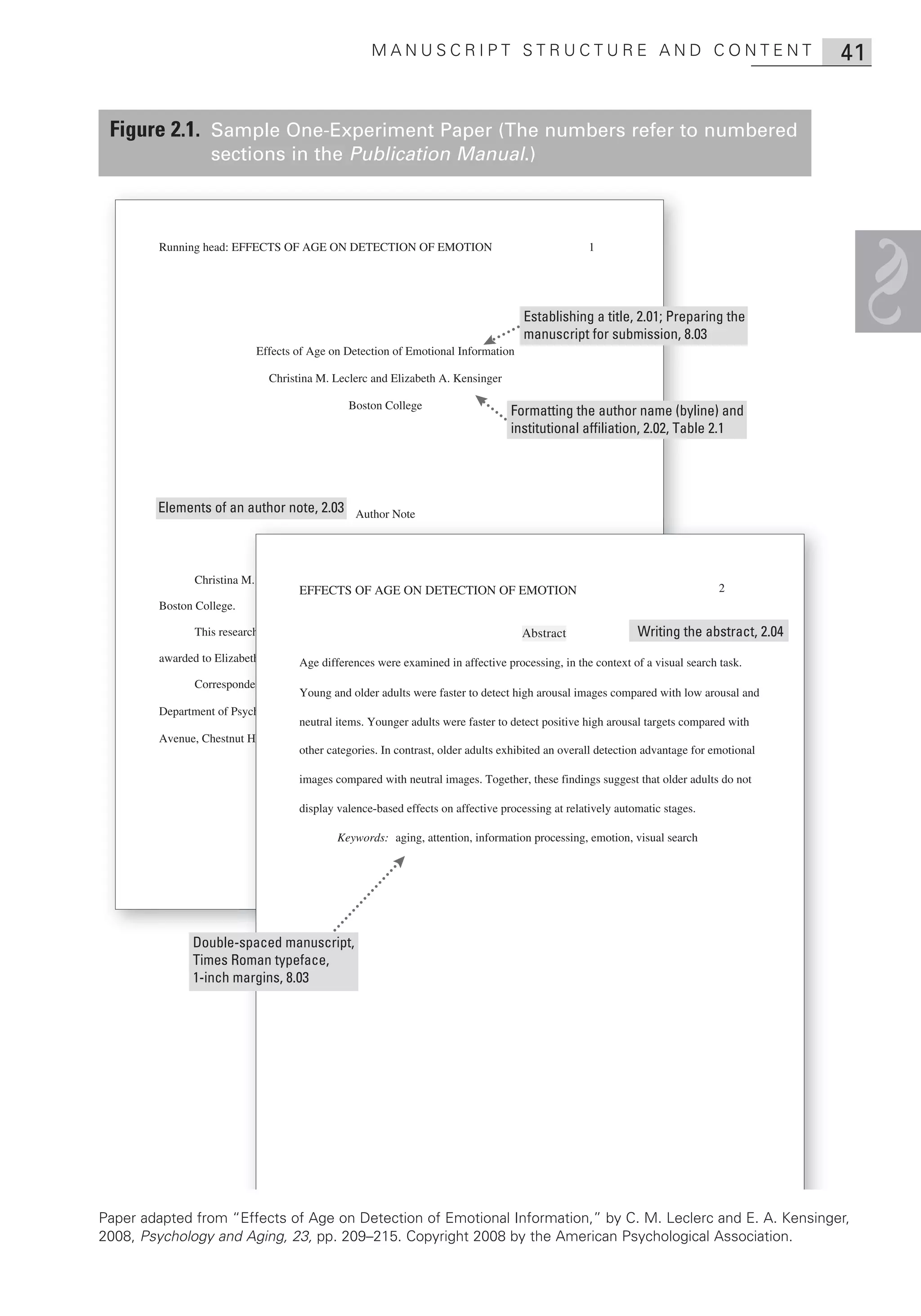 This document provides a sample one-experiment paper following APA style guidelines. It includes sections like the title, author byline, abstract, introduction, method, results and discussion. The method section describes the visual search task used, participant characteristics including ages and sample sizes, and materials/procedure. Young and older adults had to detect target images of different valence and arousal levels within 3x3 arrays. Their reaction times were recorded and compared to examine age differences in emotional processing.
