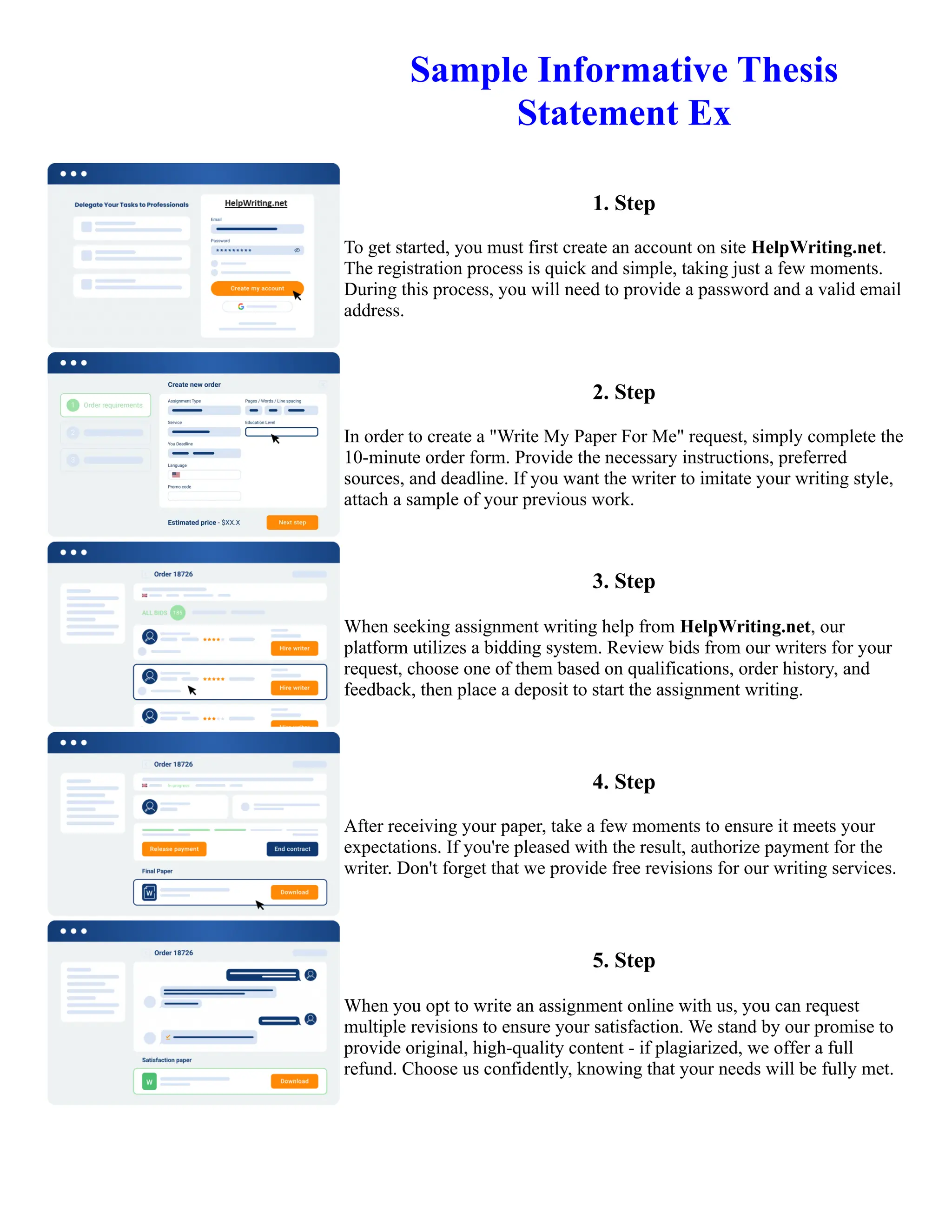 This document provides instructions for creating an account and submitting assignment requests on the website HelpWriting.net. It outlines a 5-step process: 1) Create an account with an email and password. 2) Complete a form with assignment details, sources, and deadline. 3) Review bids from writers and select one. 4) Review the completed paper and authorize payment. 5) Request revisions to ensure satisfaction, with a refund available for plagiarized work.