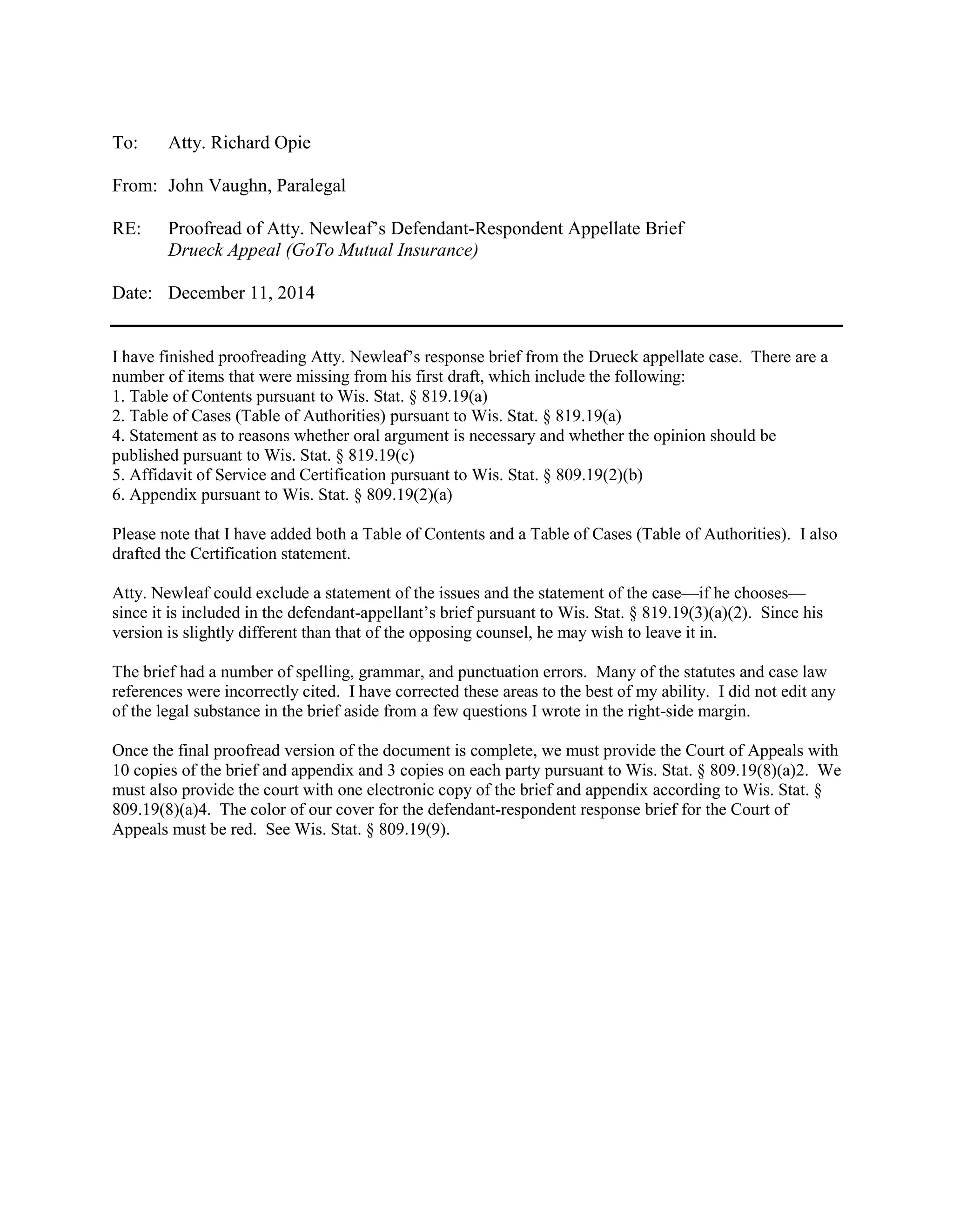 The paralegal proofread the defendant's appellate brief for errors. A number of required items were missing from the initial draft, including a table of contents, table of cases, and certification statement. The paralegal added these items and corrected spelling, grammar, punctuation and citation errors. Once the final brief is complete, 10 copies must be filed with the court along with 3 copies to each party and one electronic copy, with a red cover.
