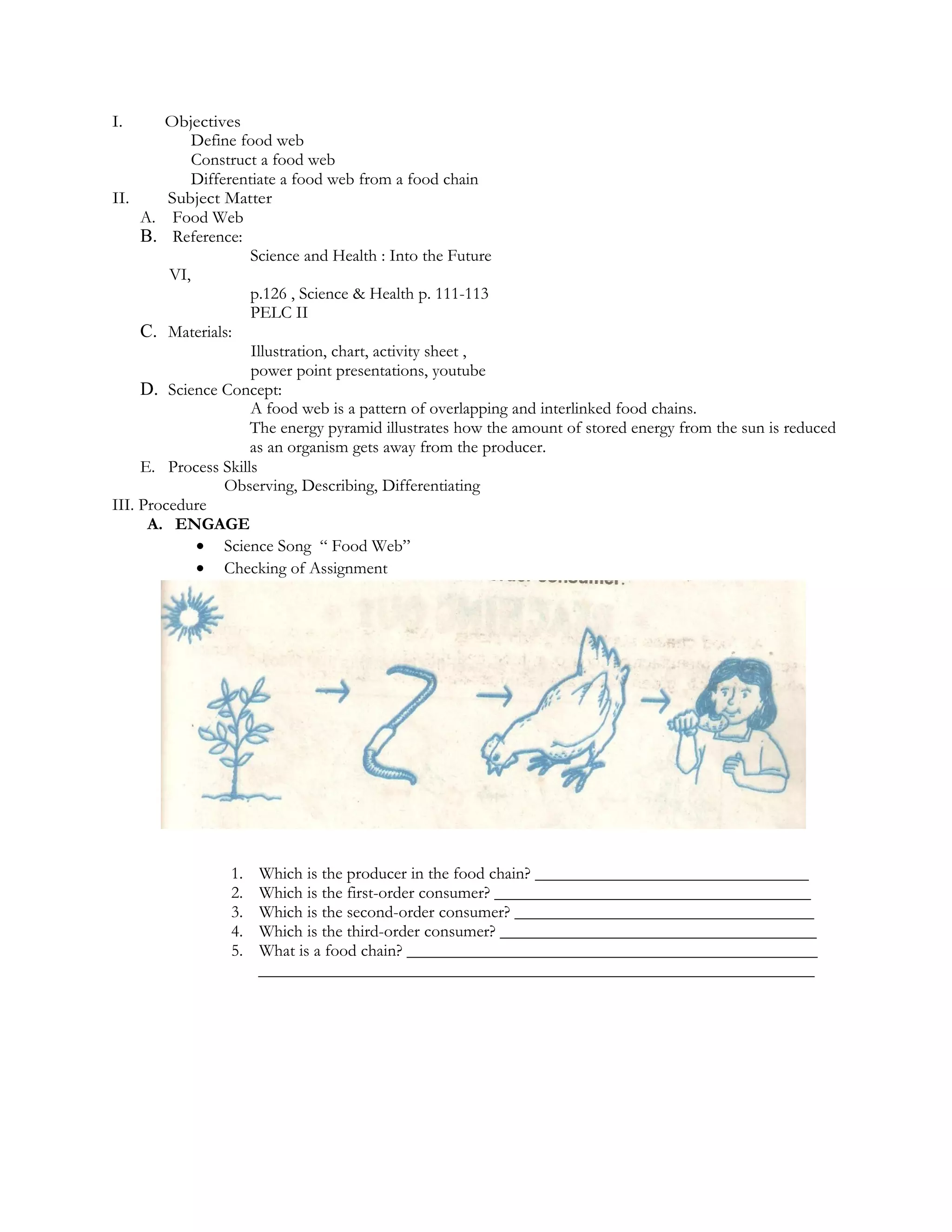The document outlines a lesson plan to teach students about food webs. The objectives are to define a food web, construct a food web, and differentiate a food web from a food chain. Students will study an illustration of a food web, answer questions about it, and then construct their own food web using local organisms. The key points are that a food web shows overlapping food chains and interlinked energy transfers between organisms, ranging from producers like plants at the bottom to various consumer levels above.