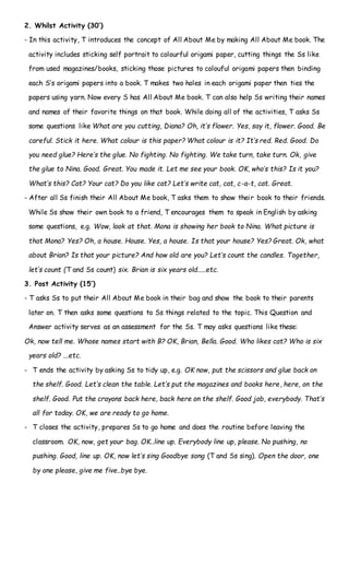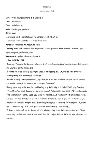 This lesson plan is for a 60-minute lesson for very young learners ages 5-6 about "All About Me." The objectives are for students to understand the concept of "All About Me" and be able to recognize themselves. During the lesson, students will make their own "All About Me" books by adding self-portraits and pictures of things they like from magazines. They will then present their books to classmates and answer questions to assess their learning.