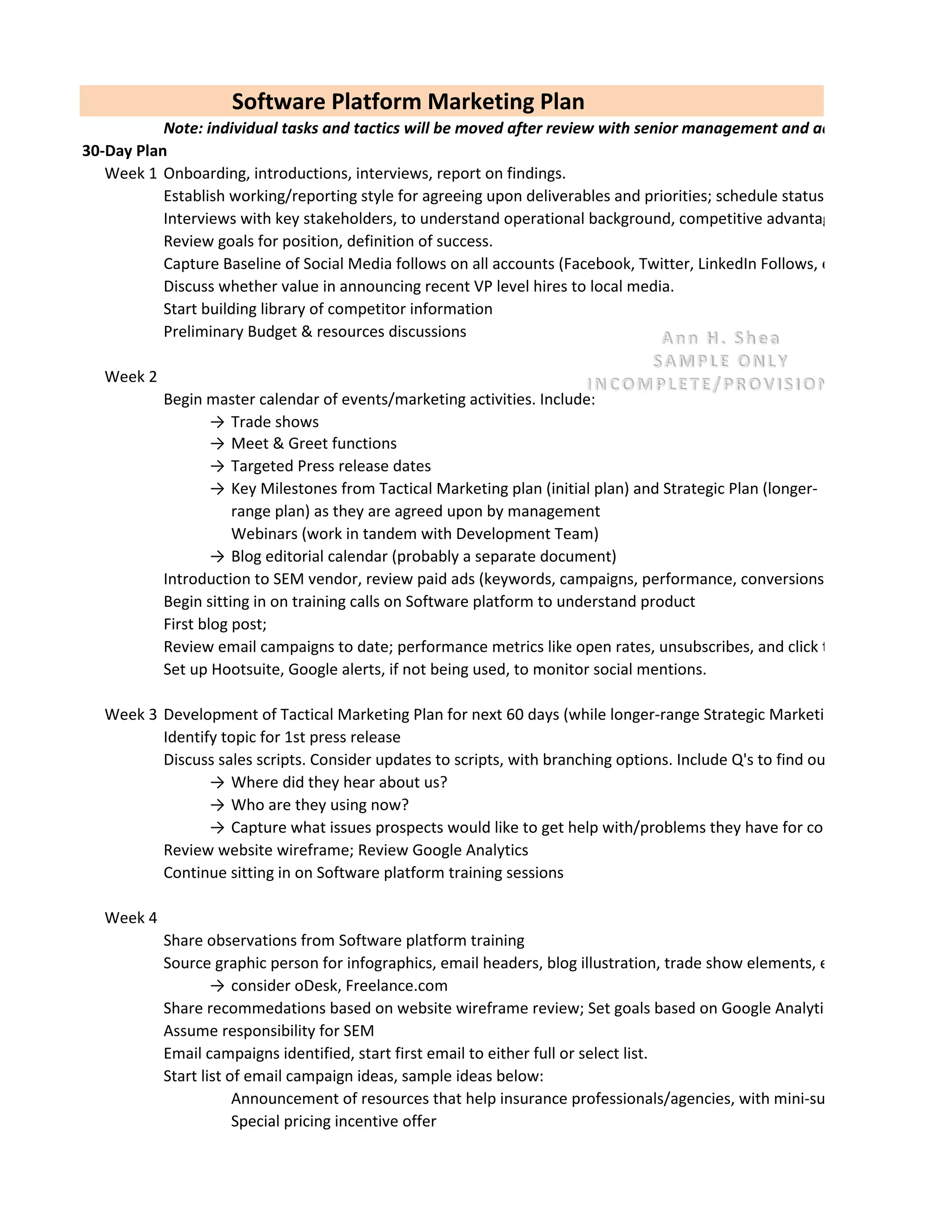 The document outlines a comprehensive 90-day marketing plan for a software platform, detailing weekly tasks such as stakeholder interviews, social media monitoring, and the development of marketing materials. It emphasizes the importance of establishing goals, creating a tactical marketing plan, and engaging with thought leaders and potential customers. Additionally, it includes future objectives like a SWOT analysis, a fully optimized mobile website, and building a competitive analysis library.
