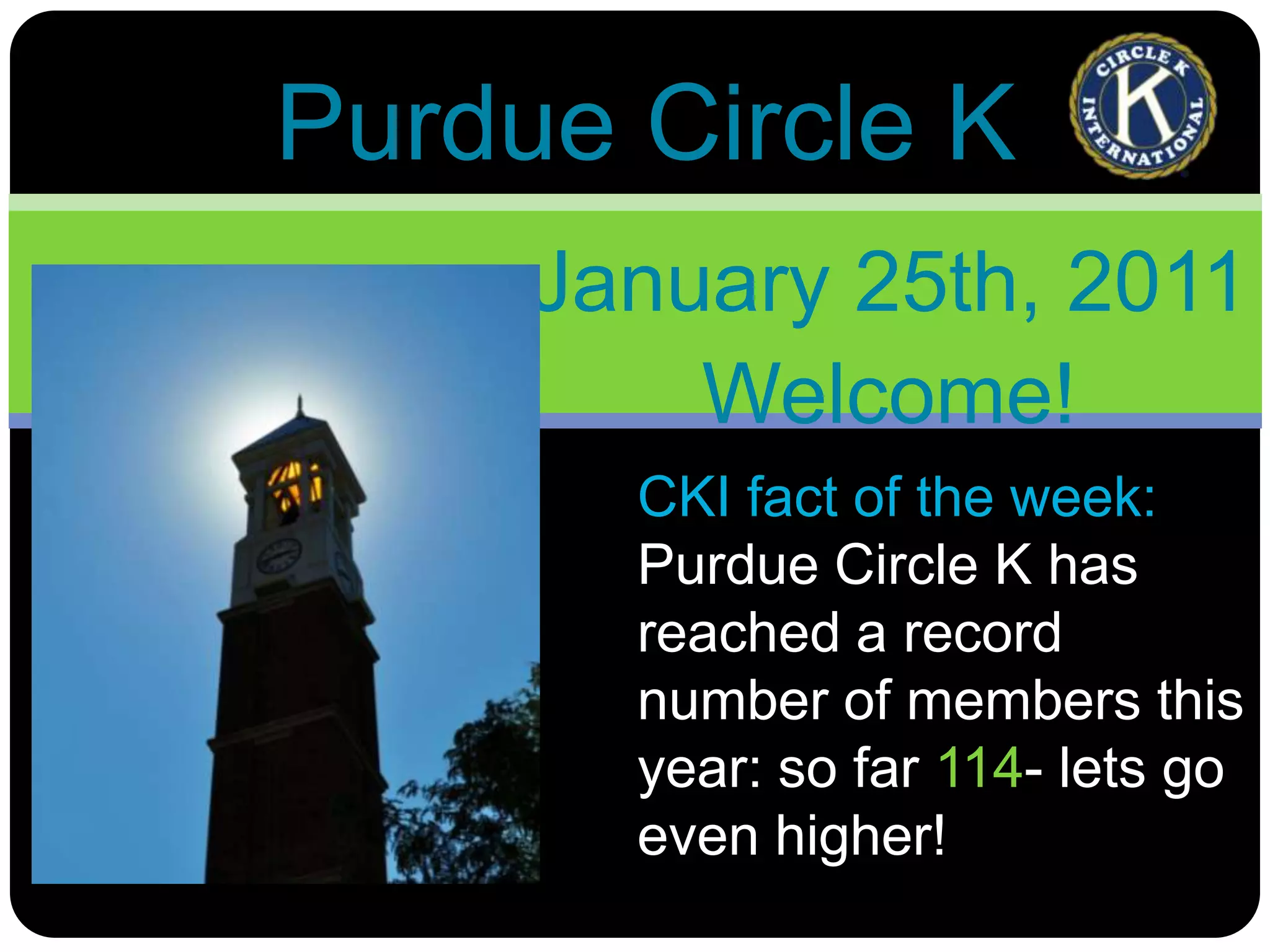 This document summarizes the activities of the Purdue Circle K club for the month of January 2011. It notes that club membership has reached a record 114 members. It also provides updates on fundraising efforts for UNICEF, upcoming social and service activities including Pictionary, a food drive competition, and events with the Kiwanis club. Information is provided on the district convention in February and opportunities to get involved with various club committees.