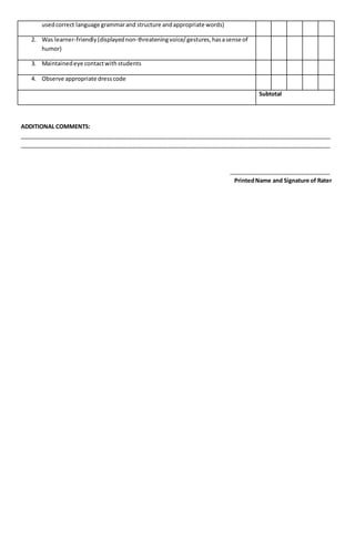 The document is a performance observation and rating sheet for lesson plans, detailing criteria for evaluating lesson planning, presentation, classroom management, student performance evaluation, and communication skills. Each category includes specific indicators rated on a scale from 1 to 5, ranging from 'needs improvement' to 'outstanding.' Additionally, there is space for additional comments and the rater's signature.