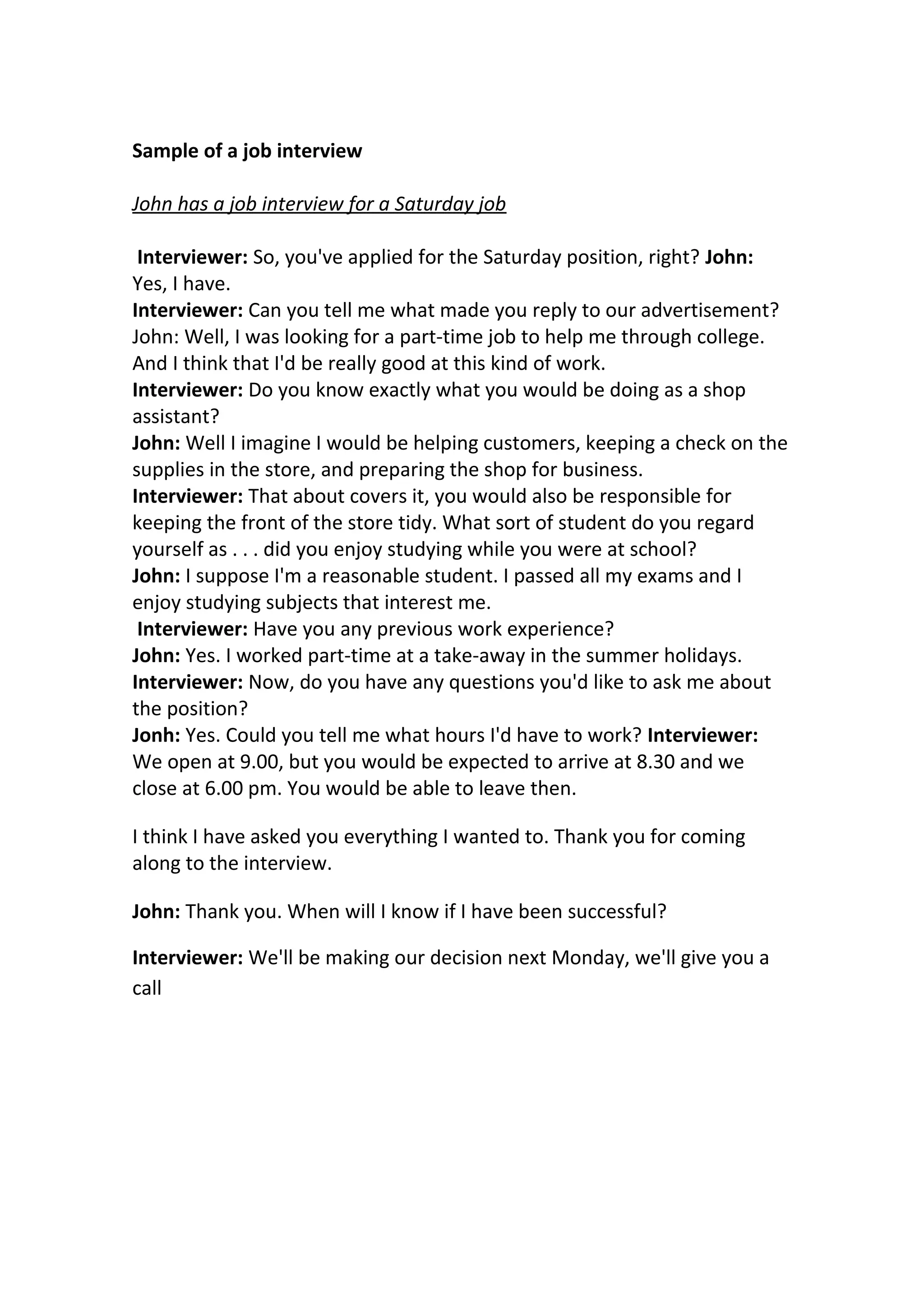John interviews for a part-time Saturday position to help fund his college education. The interviewer asks John about his reasons for applying, his understanding of the job duties like assisting customers and keeping the store tidy and stocked, his work and study experience, and his availability. John asks about the hours, and is told the store opens at 9am but he should arrive at 8:30am and closes at 6pm. The interviewer concludes by saying a decision will be made the following Monday when John will be contacted.