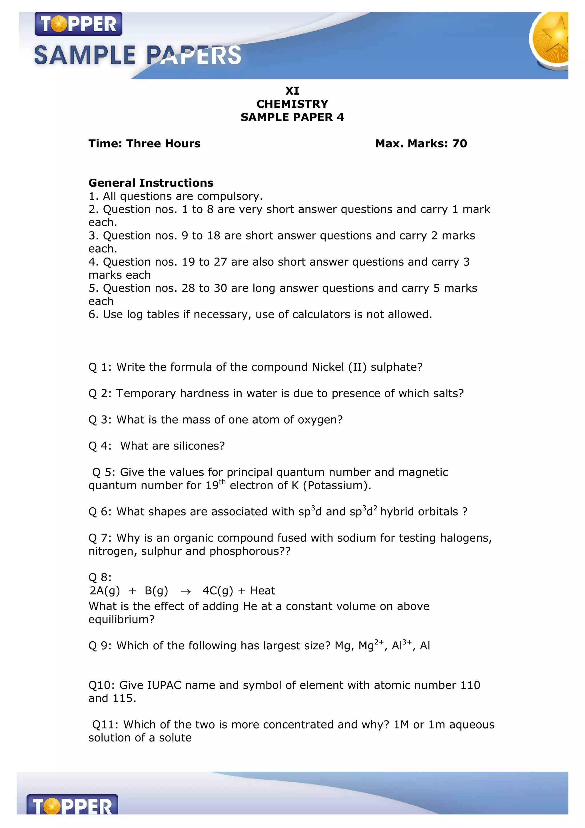 This document contains a 30 question chemistry sample exam with multiple choice and long answer questions. It provides instructions for the exam, including question types and point values. The questions cover topics such as chemical formulas, hybrid orbitals, equilibrium reactions, acid-base chemistry, and organic chemistry reactions. Sample solutions are provided for some questions as examples. The exam is designed to test understanding of essential chemistry concepts and principles.