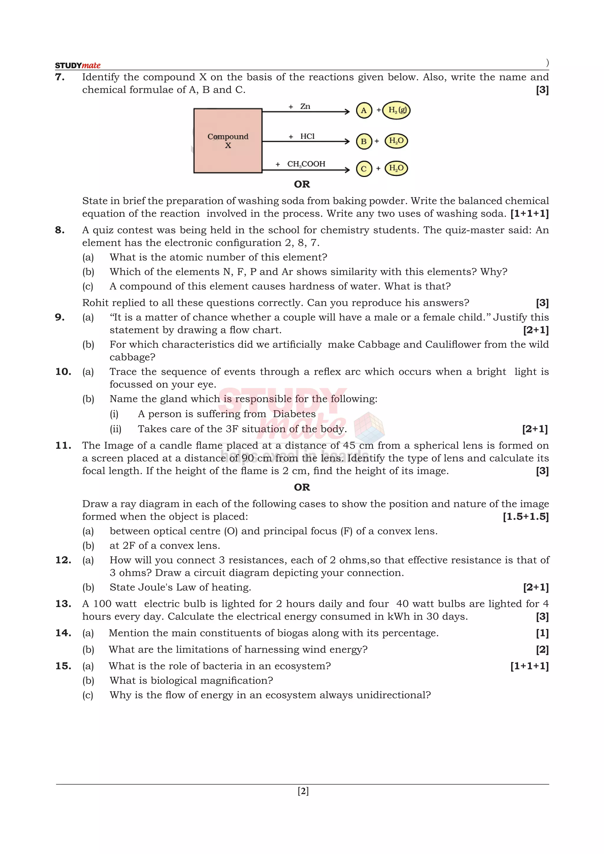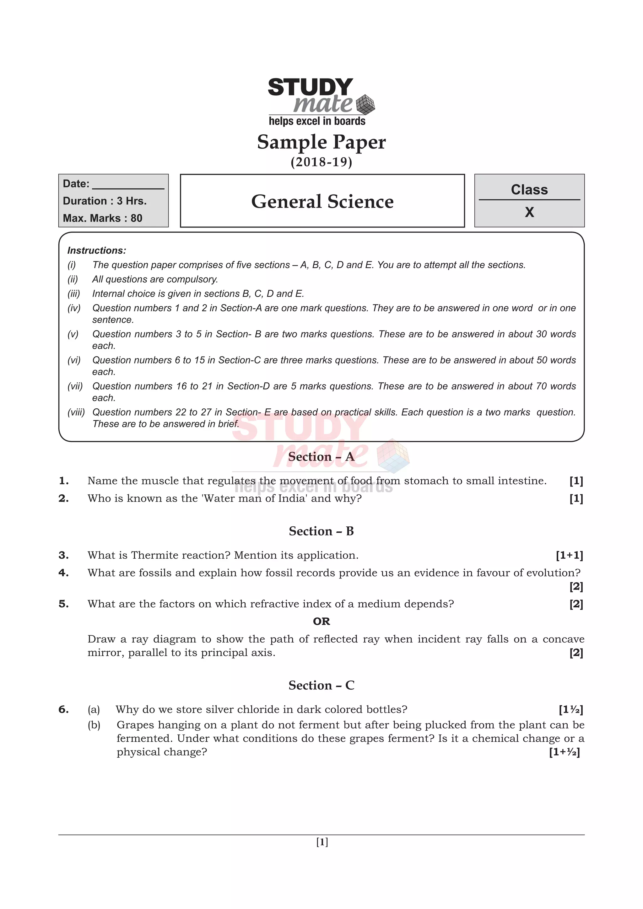 The document contains a sample question paper for a Class X General Science exam, structured into five sections with different types of questions including one-mark, two-mark, three-mark, and practical skills questions. It covers various topics in science, such as muscle function, reactions in chemistry, evolution, optical phenomena, ecosystems, and electrical principles. The document provides specific instructions regarding question format and marks allocation.