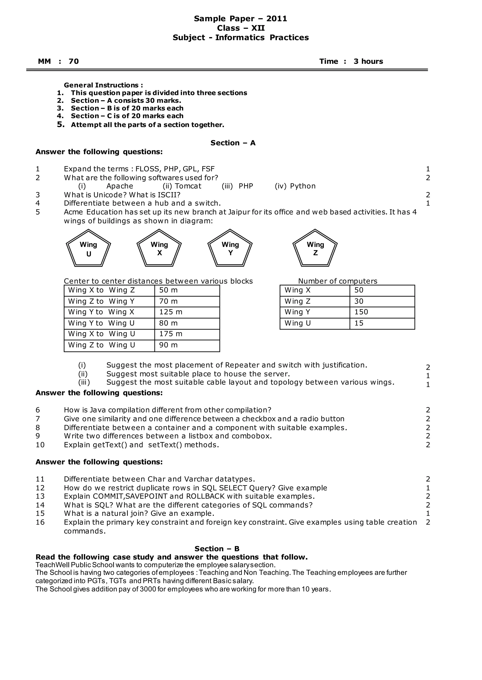 The document is a sample paper for Class XII Subject Informatics Practices. It consists of 3 sections - Section A with 30 marks, Section B with 20 marks each, and Section C with 20 marks each. Section A contains short answer questions, Section B contains case studies and questions, and Section C contains SQL queries and output questions. The document provides answer keys for all questions.