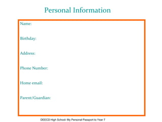 This document is a student's personal passport for their transition to Year 7. It contains information about the student's primary school experiences, interests, skills in various subjects, and thoughts on starting high school. The student rates their abilities and provides examples of work. They also describe themselves and personality.