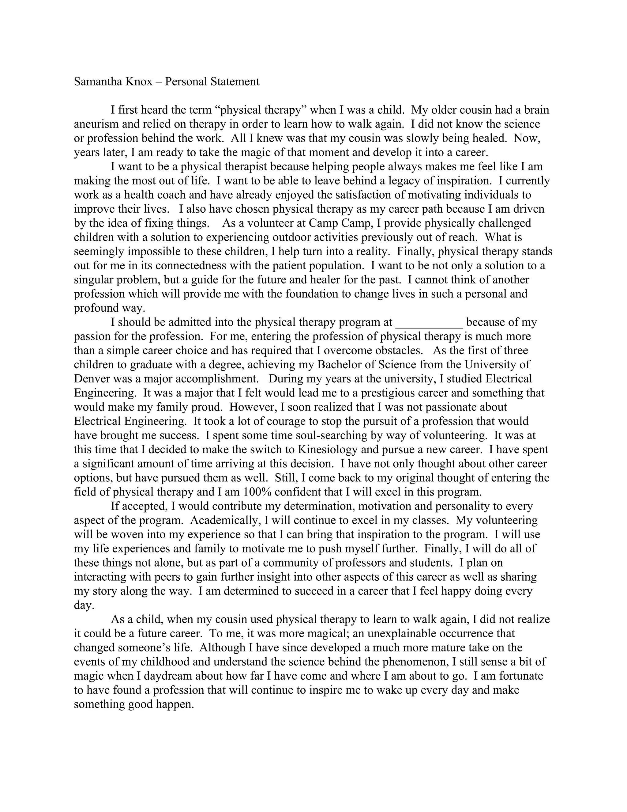 Samantha Knox shares her journey toward pursuing a career in physical therapy, driven by a childhood experience with her cousin's recovery and her current work as a health coach. After initially studying electrical engineering, she realized her true passion lies in helping others through kinesiology, which she has pursued actively through volunteering. Knox expresses confidence in her abilities and dedication to contributing positively to the physical therapy program if admitted.