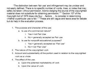 The document discusses recent amendments to U.S. Copyright Law from 2004-2005 including the Copyright Royalty Judges Program Technical Corrections Act, Family Entertainment and Copyright Act, Intellectual Property Protection and Courts Amendments Act, Satellite Home Viewer Extension and Reauthorization Act, and the Copyright Royalty and Distribution Reform Act. It also mentions that Creative Commons provides free tools to let creators easily mark their work with different copyright licenses to allow for some sharing and reuse while still maintaining some rights.