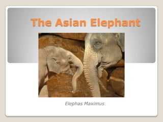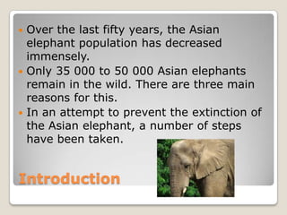 The Asian elephant population has decreased significantly over the last 50 years to only 35,000-50,000 remaining in the wild across 13 countries. The three main causes are hunting for ivory, loss of habitat due to deforestation, and conflicts when elephants enter farms. To address this, Asian elephants are now protected, international ivory trading is banned, and elephant sanctuaries have been created to preserve habitat. It is hoped these measures can prevent the Asian elephant's extinction.