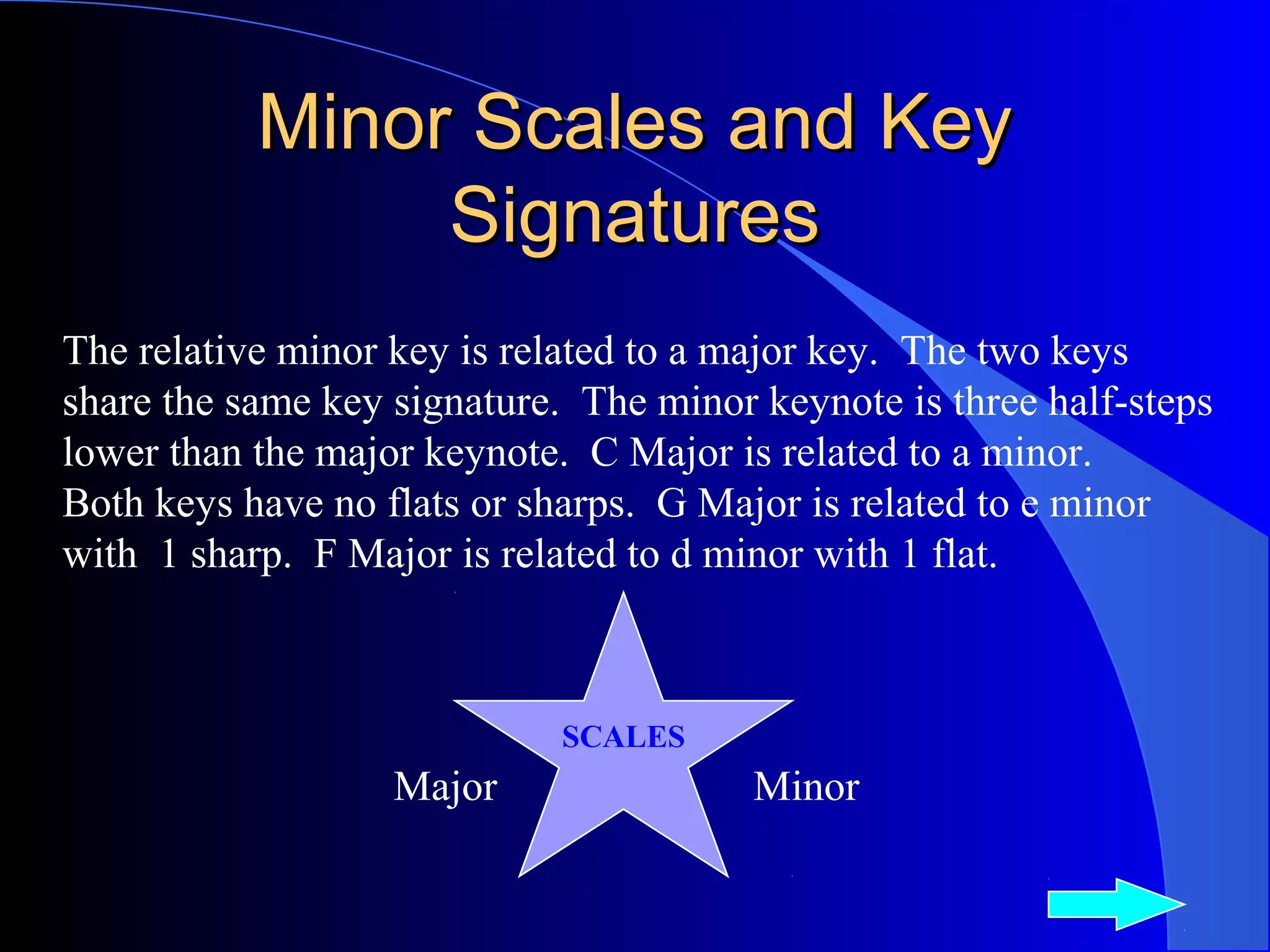 - The relative minor key shares the same key signature as its relative major key but has a minor tonic that is three half steps lower. For example, C major and A minor both have no flats or sharps in their key signature.