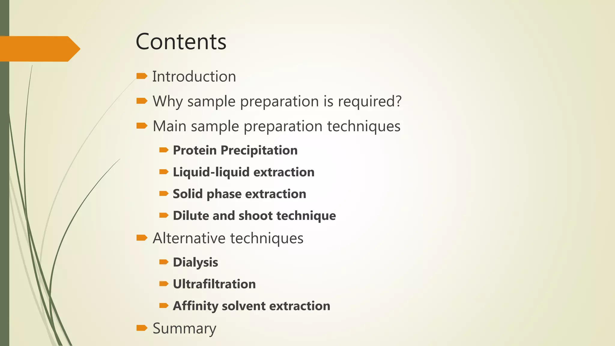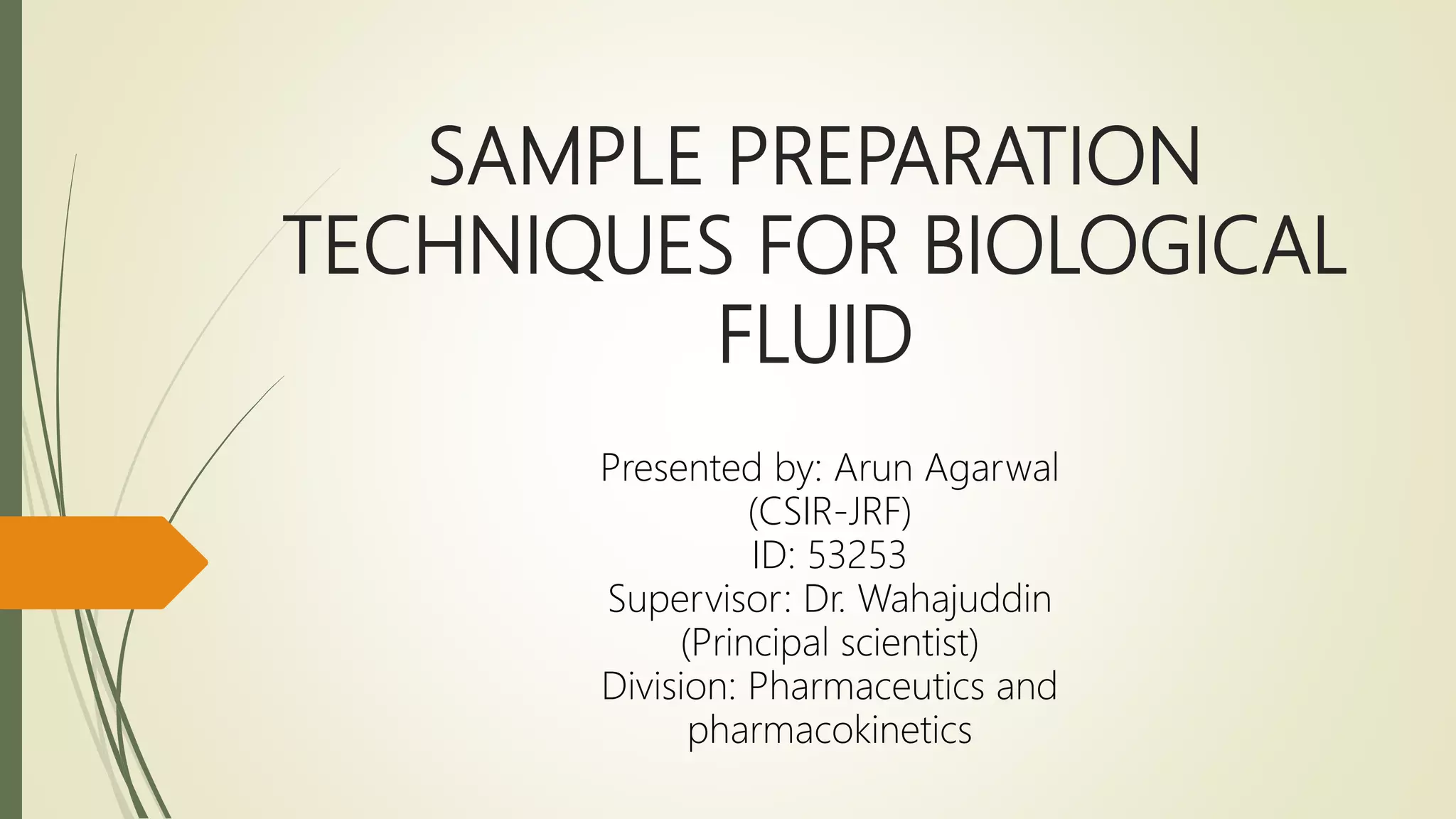 The document discusses various sample preparation techniques for biological fluids in analytical chemistry, emphasizing the need for such processes due to the complex nature of biological matrices that can contaminate instruments. Techniques covered include protein precipitation, liquid-liquid extraction, solid-phase extraction, and alternatives like dialysis and affinity sorbent extraction, each with distinct advantages and disadvantages. It highlights modern laboratory practices, particularly the utilization of 96-well plates for high-throughput sample processing.