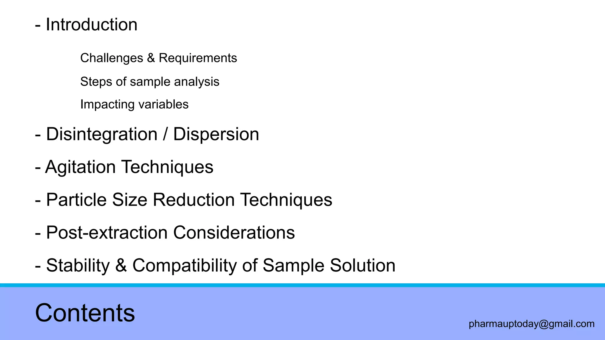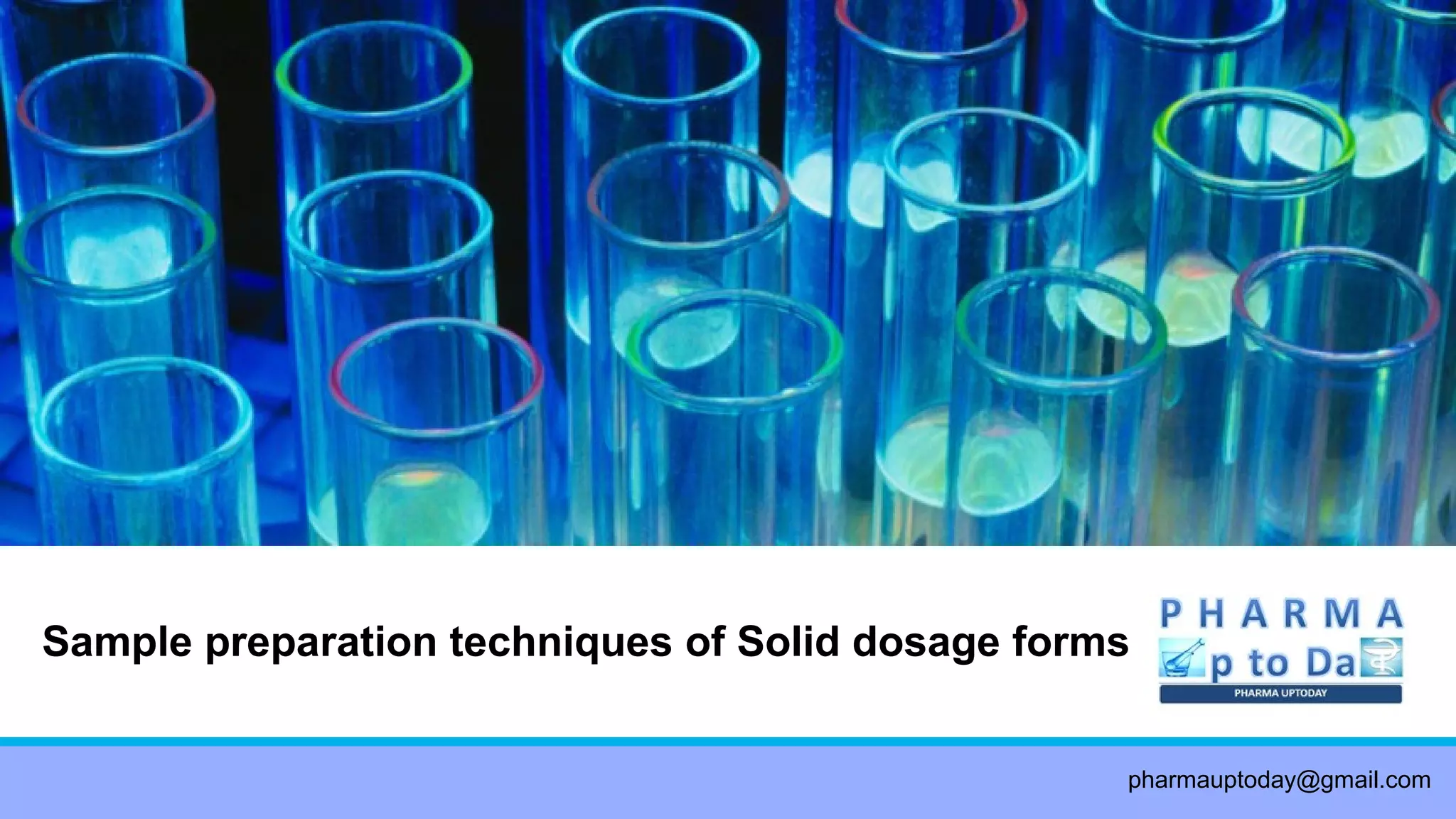 Knife mills and blenders are particle size reduction techniques that can be used to disperse solid dosage forms like non-disintegrating tablets for analysis. Mechanical techniques like grinding with a mortar and pestle or milling in a ball mill are commonly used to reduce the particle size and facilitate extraction of drugs from solid oral dosage forms. Agitation techniques like shaking, stirring, vortexing, and sonication are then used to further facilitate dispersion and mixing during sample preparation. The selection of appropriate particle size reduction and agitation techniques depends on the properties of the specific drug product and dosage form being analyzed.