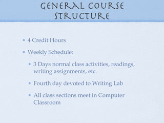 The document summarizes the structure of a basic writing course at Southern Illinois University Edwardsville. The course is 4 credit hours, meeting 3 days a week for normal class activities and the 4th day in a writing lab. Instructors and professors receive training while teaching assistants mentor in the weekly lab sessions to aid students as they work on class projects or other writing assignments.