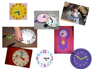 The document outlines a first grade lesson plan on telling time by the hour. Students will learn to read analog clocks and understand the relationship between the hour and minute hands. The lesson involves making paper plate clocks, singing a song about telling time, reading a story that incorporates clocks, and having students write down times at random intervals. The lesson aims to help students comprehend why telling time is important and be able to read clocks to the hour and half hour.