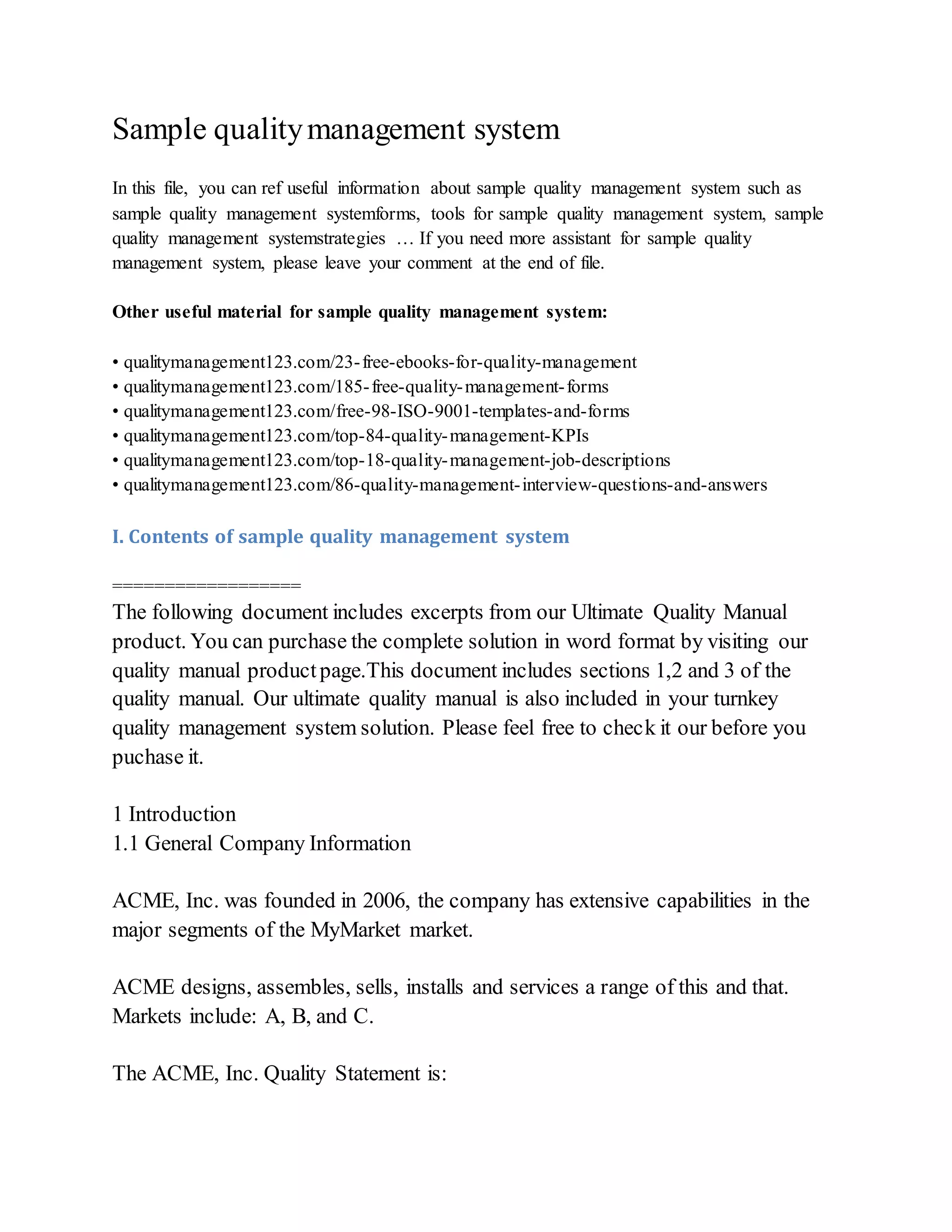 This document provides an overview of sample quality management system documentation and resources. It includes sections from a quality manual template covering topics such as the company background, quality policy, quality management system scope and documentation structure. Additional resources listed include free eBooks, forms, templates and examples of common quality management tools like check sheets, control charts, Pareto charts, scatter plots and histograms. The document aims to assist those looking to implement or improve a quality management system.