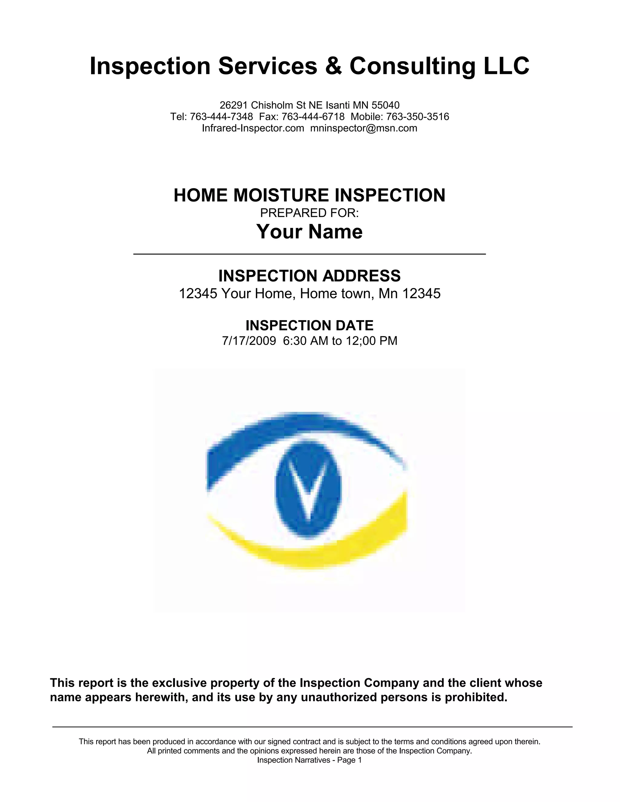 This home inspection report summarizes the findings of a moisture inspection performed at 12345 Your Home, Home town, Mn 12345 on July 17, 2009. Elevated moisture readings over 20% were found in some areas of the home. The inspection also noted staining on the stucco and deck ledger board that may indicate moisture issues. Recommendations included installing kick out flashing, casing beads, and properly caulking windows.